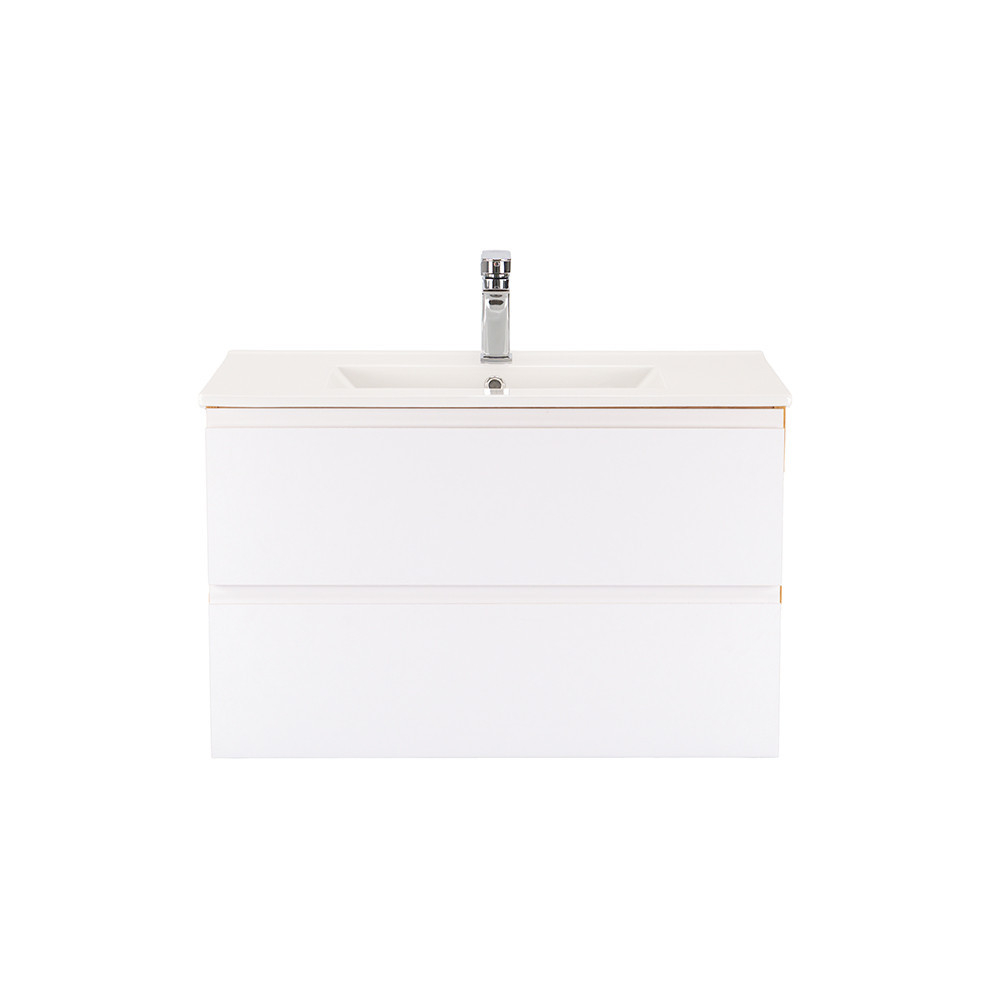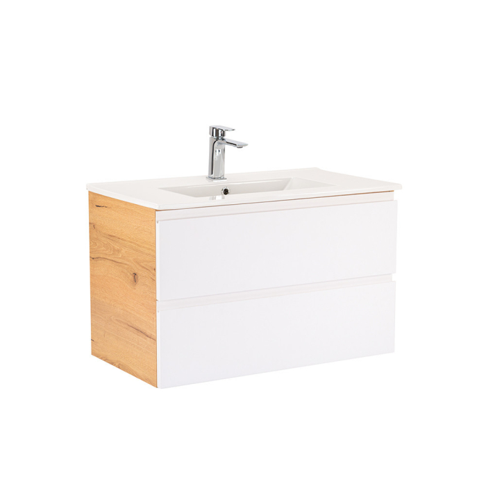 Dulapul Vario Pull 80 cu chiuvetă este o alegere elegantă și practică pentru băile moderne. Dimensiunile sale compacte îl fac ideal pentru băile mici și medii, iar designul din stejar și alb cu profil J conferă spațiului un aspect elegant. Închiderea amortizată a sertarelor și designul suspendat oferă confort și curățare ușoară, în timp ce materialele de calitate asigură durabilitate îndelungată.