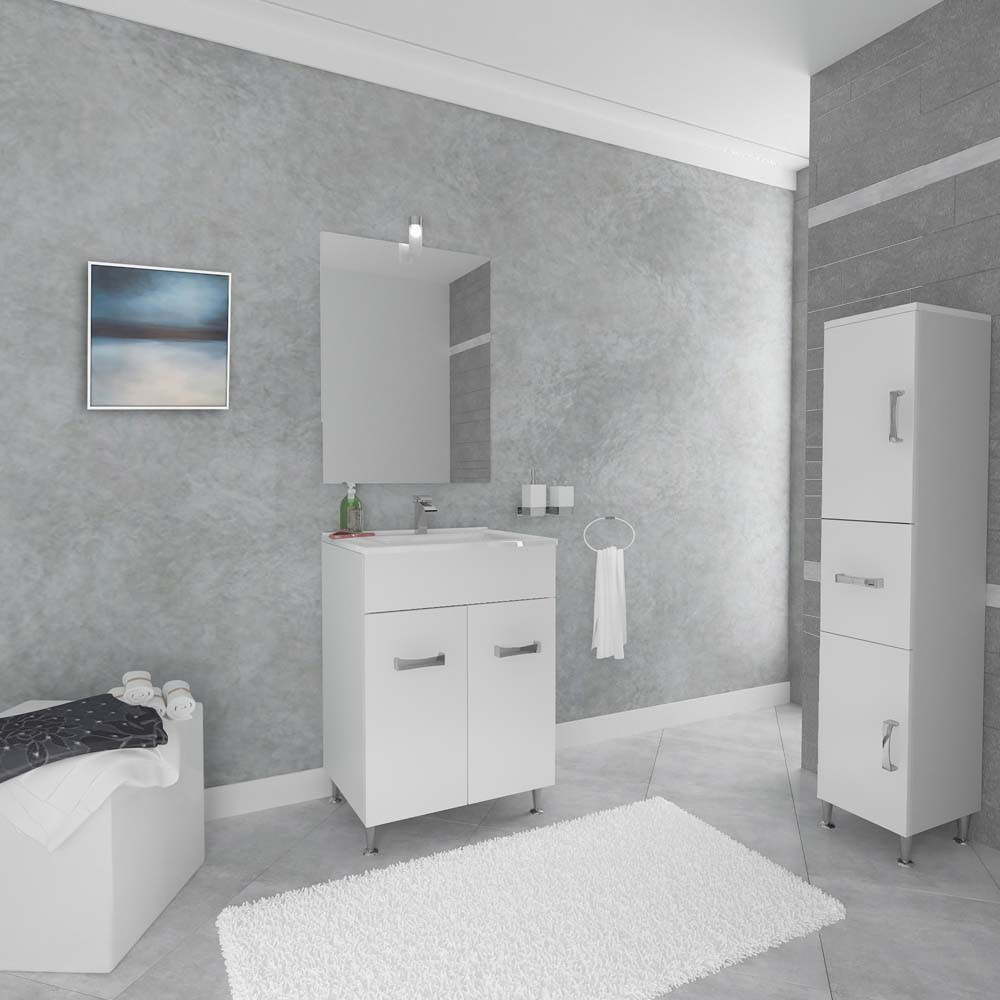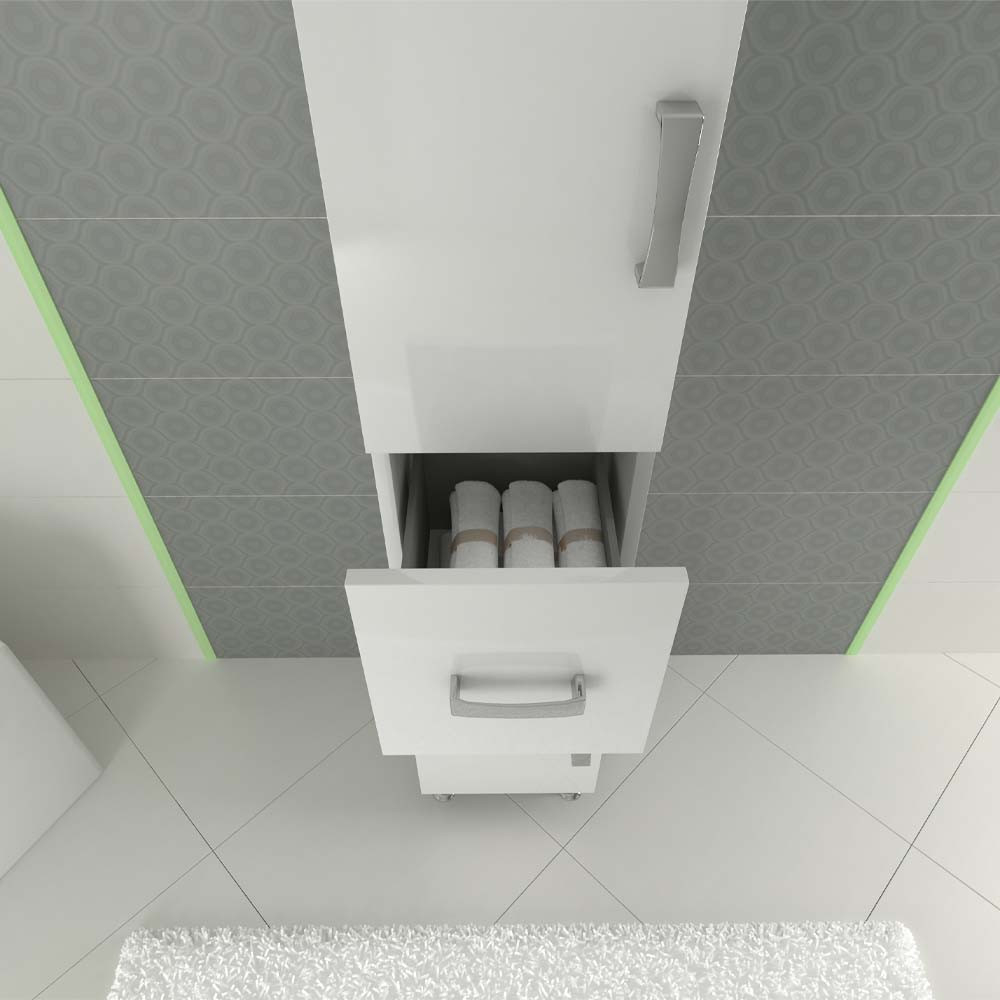 Mobilierul de baie are 3 mânere cromate și 4 picioare , ceea ce îl face mai elegant și practic datorită curățării ușoare. Picioarele sale nu ocupă mult spațiu și, datorită designului lor , sunt ușor de curățat , putând fi curățate cu ușurință și sub mobilă. Mobila are două uși și un sertar, unde putem depozita convenabil obiectele noastre de baie, cum ar fi prosoapele.