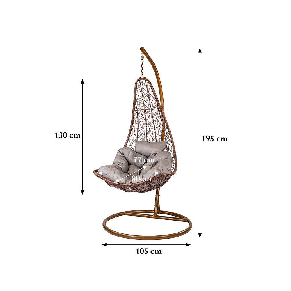 Fotoliul vine cu o pernă gri moale din două piese, cu o husă de pernă impermeabilă detașabilă pentru o curățare ușoară. Structura cadrului are 195 cm înălțime și 105 cm diametru, în timp ce coșul -105 cm diametru și 68 cm adâncime- oferă un loc confortabil pentru relaxare.