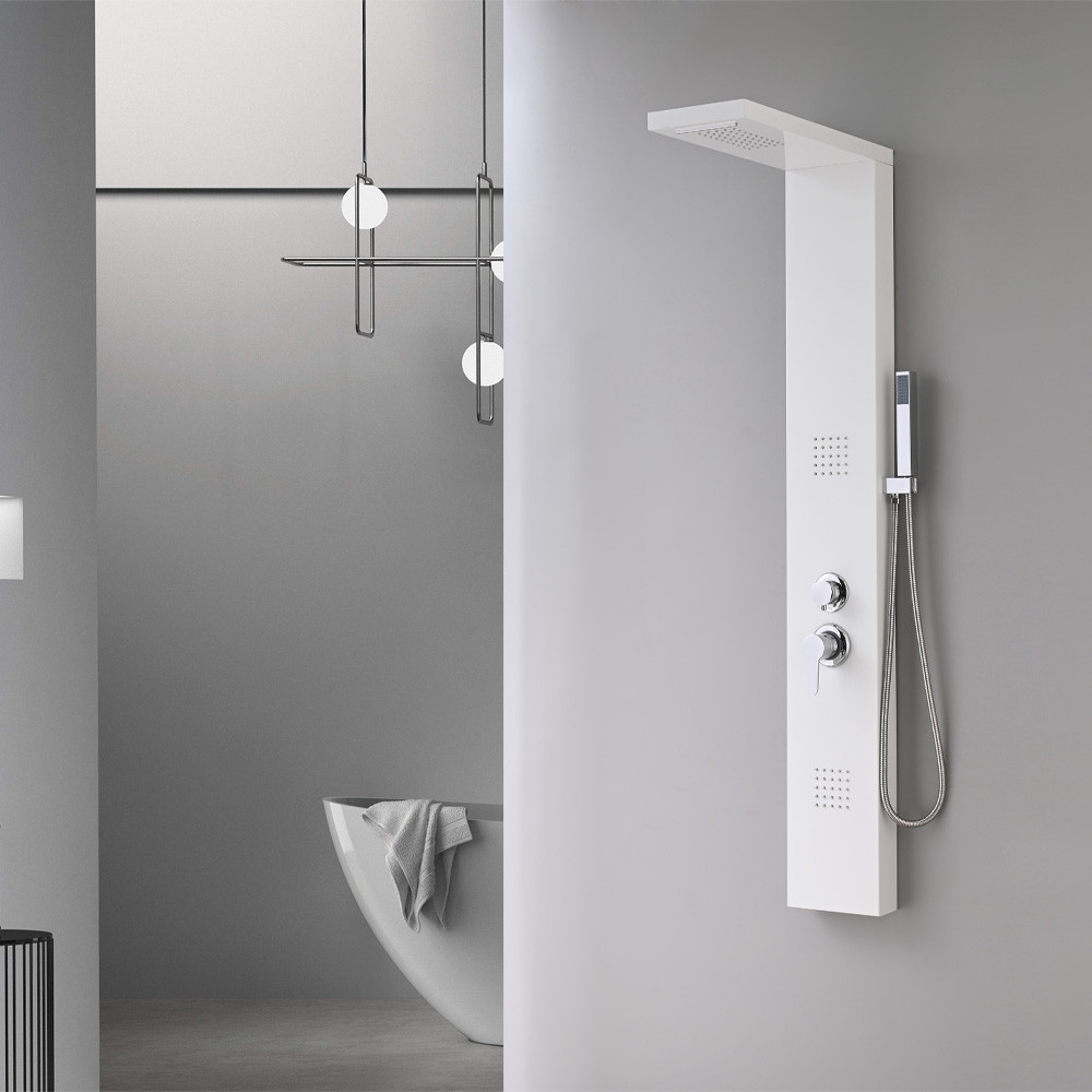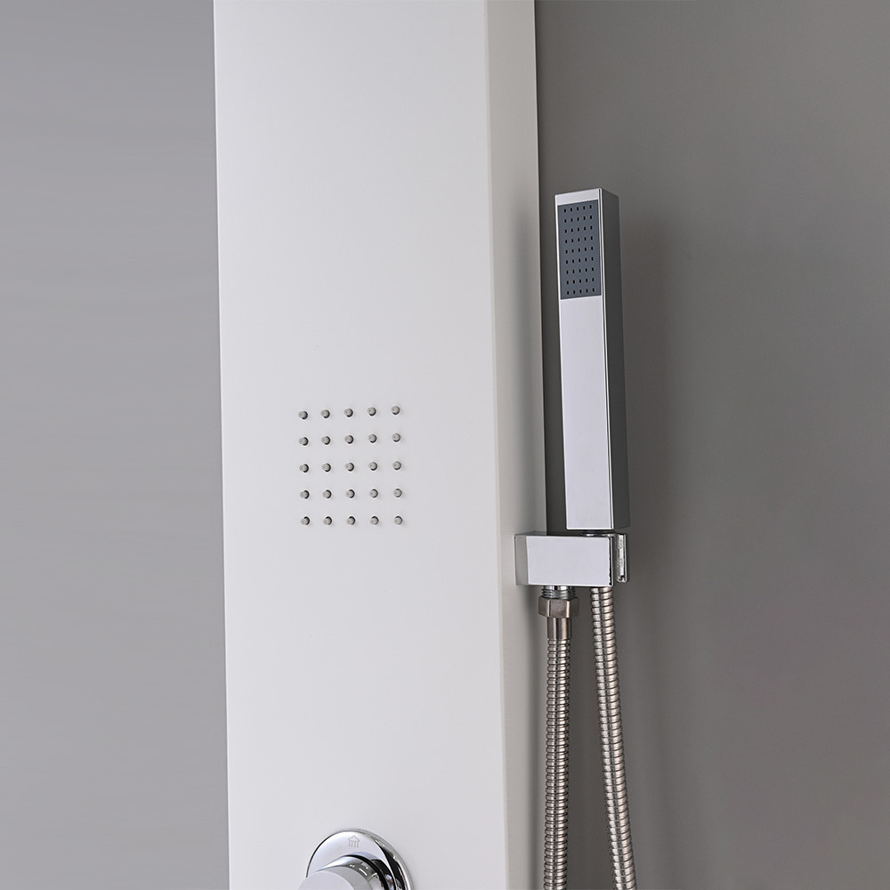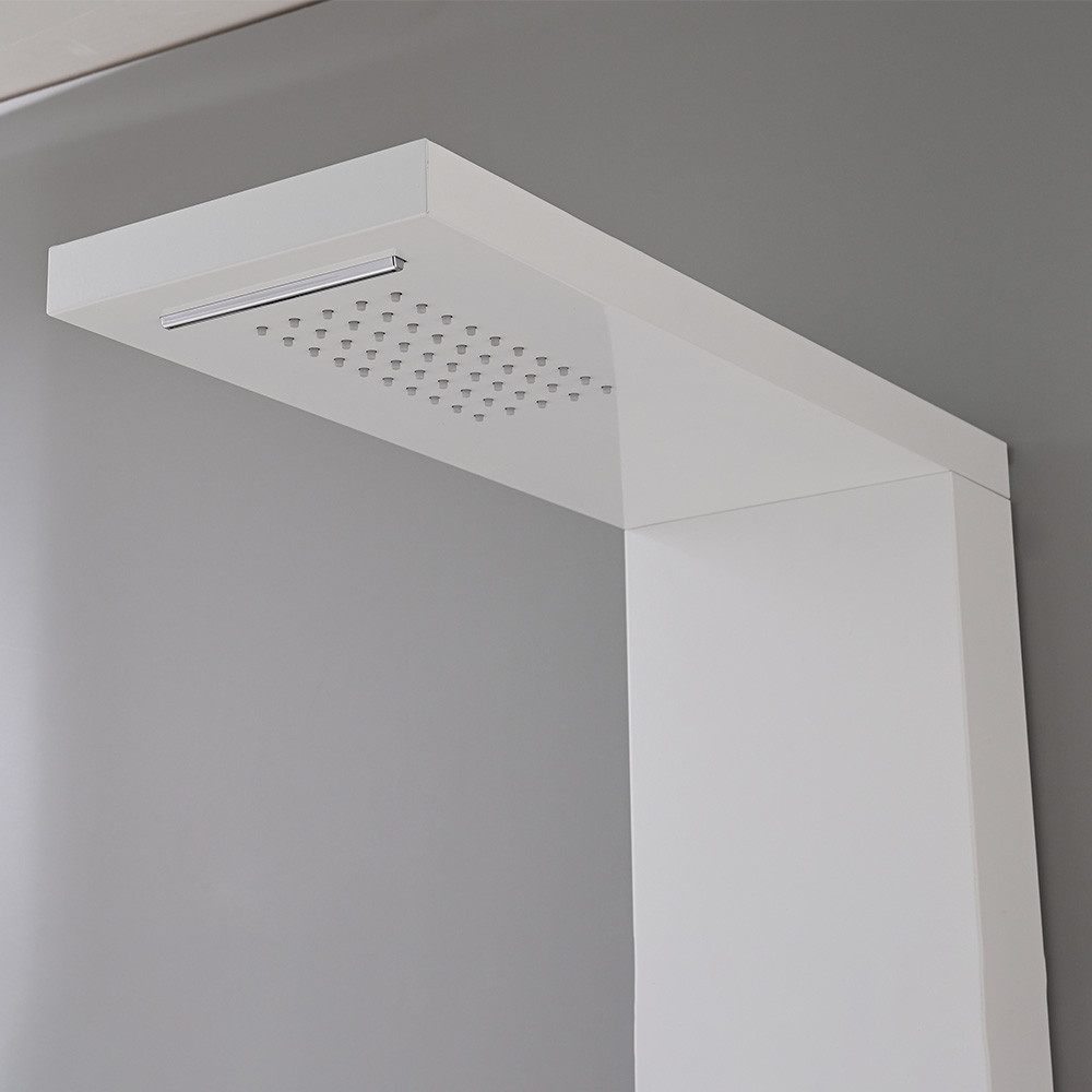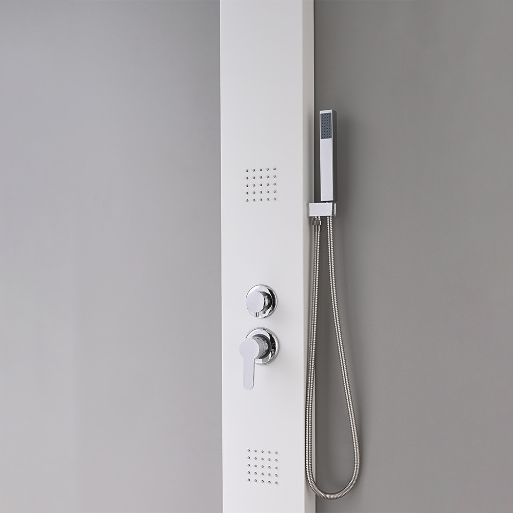 Panoul de duș hidromasaj Malaga White este o soluție uimitoare și modernă pentru băi, oferind o experiență de duș luxoasă. Acest panou de duș a fost conceput special pentru confort și relaxare, în timp ce designul său bogat în caracteristici și elegant îl face parte din interiorul băii. Panoul de duș măsoară 145x20x7 cm. Este fabricat dintr-un aliaj de aluminiu vopsit care este puternic și durabil, fiind în același timp ușor și menținându-și aspectul estetic în timp. Această alegere modernă a materialului garantează o durată lungă de viață a panoului de duș.