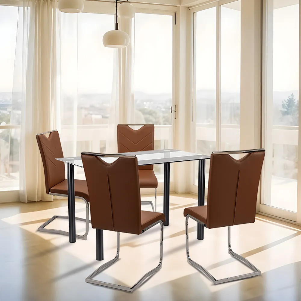Setul de masă Darina 4 în 1, cu aspectul său elegant și modern, este o alegere excelentă pentru orice bucătărie sau living. Piesa centrală a setului este masa pătrată din sticlă Riona de 120 cm, care are o structură din oțel negru, vopsită în câmp electrostatic, și un blat din sticlă securizată cu grosimea de 8 mm. Această masă nu este doar estetică, ci și durabilă și ușor de curățat. Setul include patru scaune de sufragerie Letti, cu șezut din piele textilă maro și cadru metalic, asigurând confort și stabilitate. Designul modern și curat al scaunelor completează perfect masa, creând o zonă de luat masa armonioasă și elegantă. Setul Darina emană calitate și eleganță în fiecare detaliu, fiind o alegere ideală pentru prânzurile în familie și întâlnirile cu prietenii.