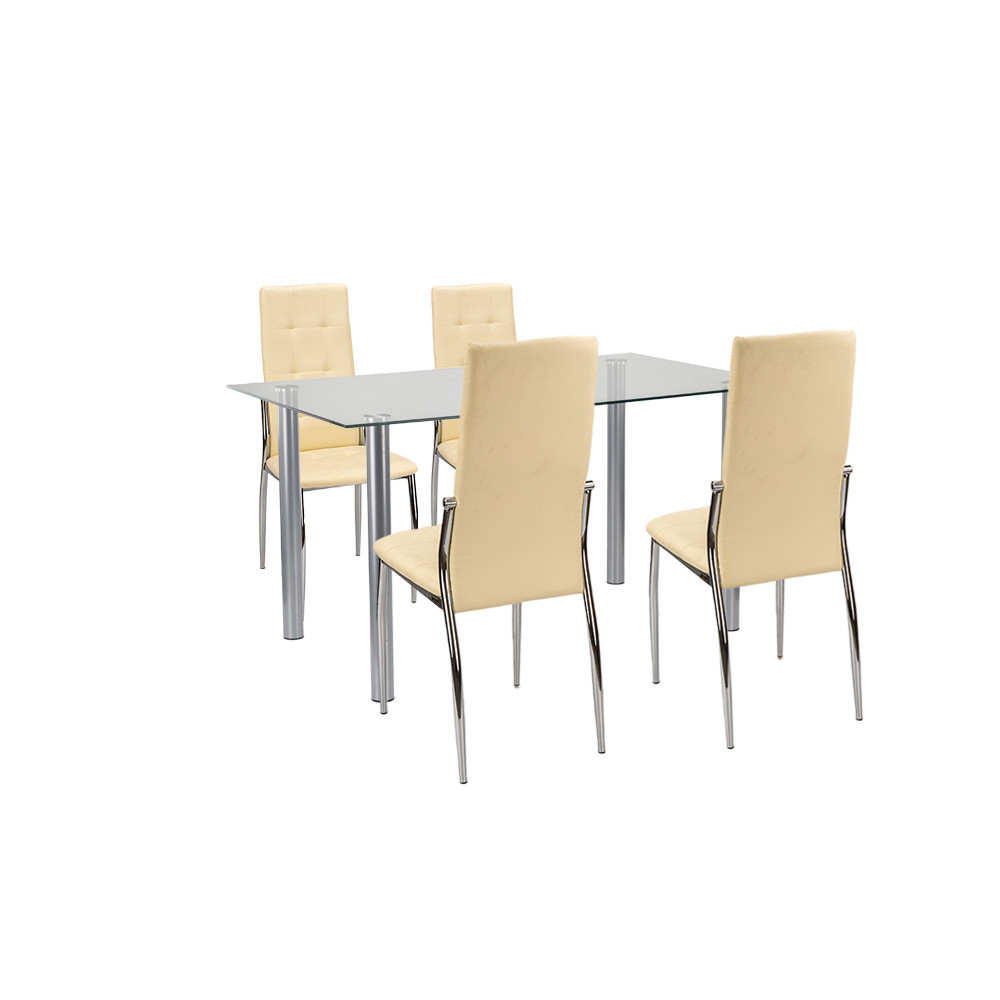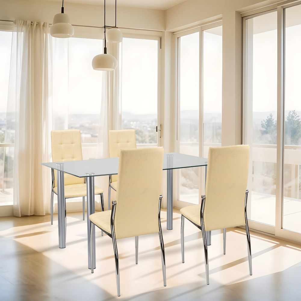 Setul de masă Lina4+1 este o alegere deosebit de elegantă și practică pentru orice locuință. Setul include patru scaune de dining cu design ergonomic și o masă de dining cu aspect modern, care împreună creează un aspect curat, dar sofisticat pentru bucătăria sau sufrageria dvs. Combinația de piele textilă bej și metal este atemporală, astfel încât este garantat să fie un companion loial pentru mulți ani de luat masa acasă.