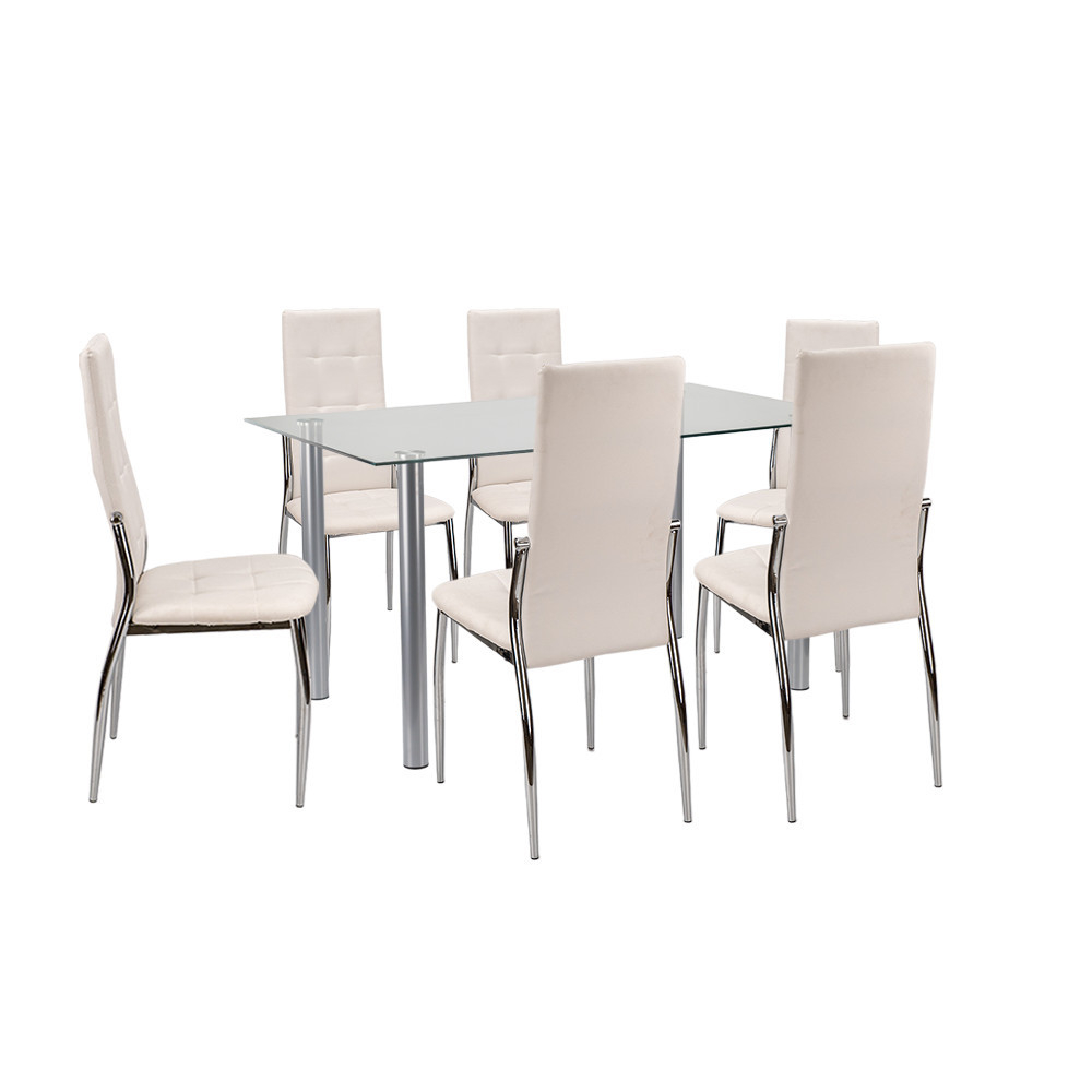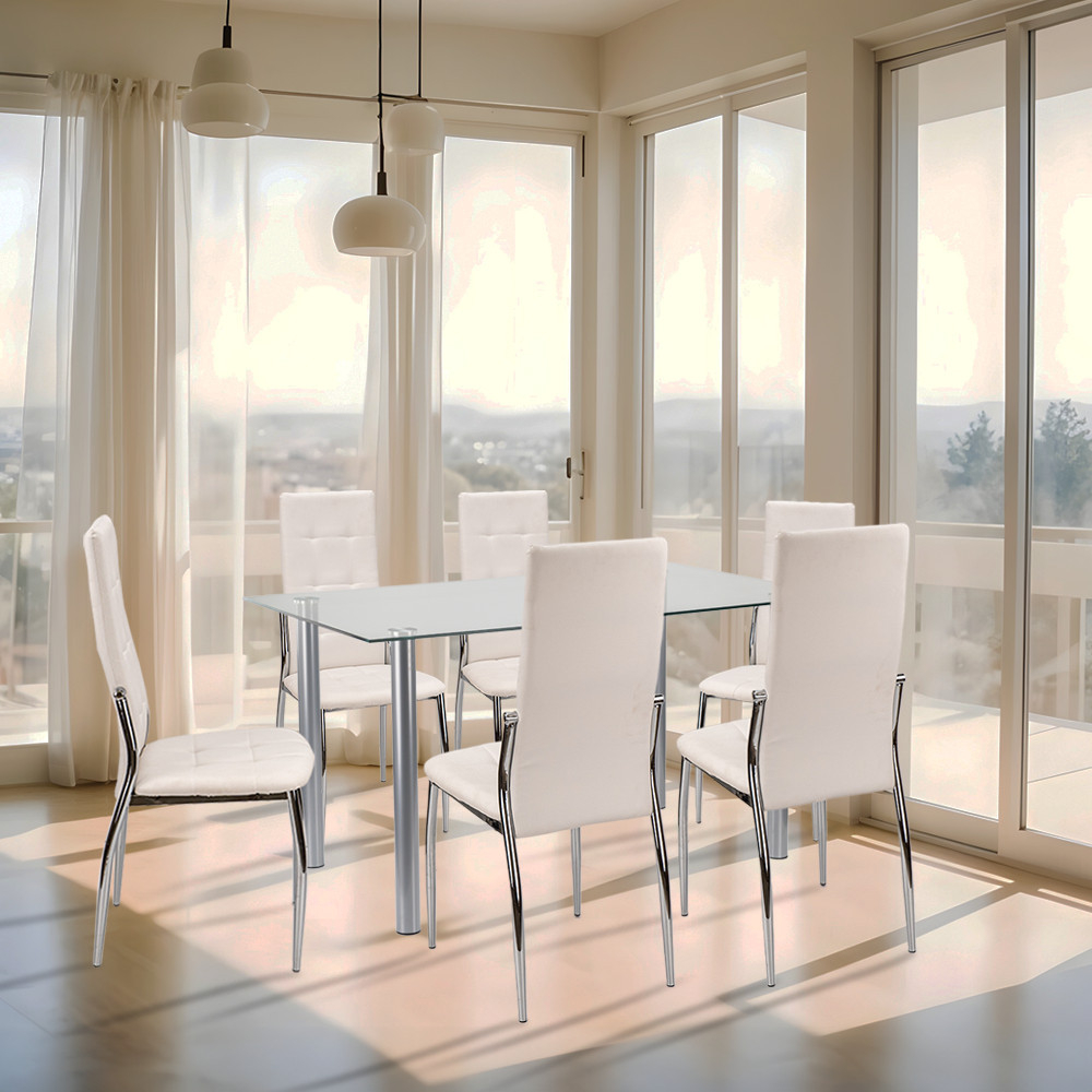 THE Set de masă Lina 6 1 o alegere unică, elegantă și practică pentru orice casă. Setul include șase scaune de sufragerie cu design ergonomic și o masă cu aspect modern, care împreună conferă un aspect curat, dar sofisticat bucătăriei sau sufrageriei dumneavoastră. Combinația dintre pielea textilă albă și metal este atemporală, așa că este garantat că va fi companionul tău loial în timpul meselor acasă timp de mulți ani.