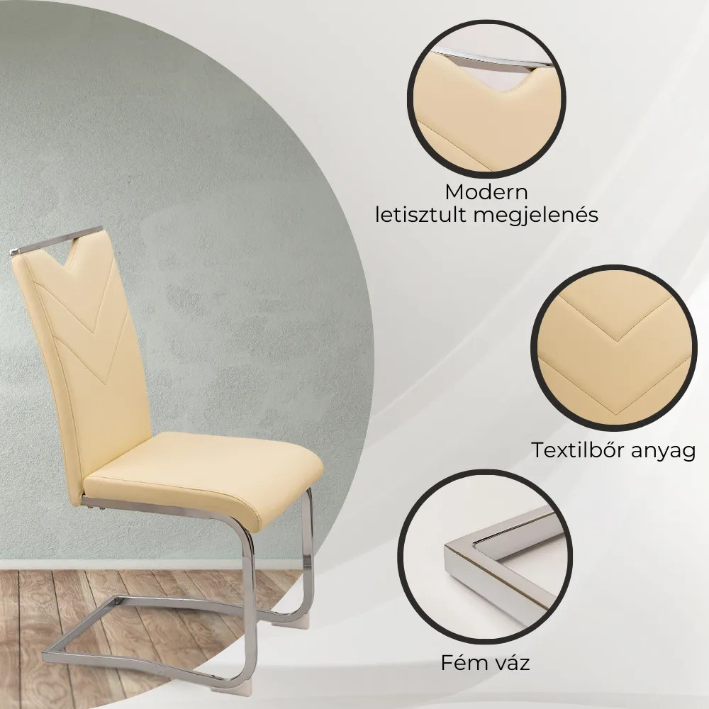 Scaunele de sufragerie Letti au un aspect curat și modern, garantând crearea unei atmosfere speciale în orice sufragerie. La proiectarea scaunelor, s-a acordat o atenție deosebită atât aspectului, cât și designului, pentru a oferi confort maxim utilizatorului. Pentru suprafața de ședere a fost folosită piele textilă, iar pentru picioarele și structura scaunului a fost folosit metal. Scaunul este disponibil în patru culori diferite, astfel încât fiecare poate găsi modelul potrivit pentru el. Produsul este livrat montat plat, prevenind orice deteriorare. Asamblarea scaunului nu durează mult.