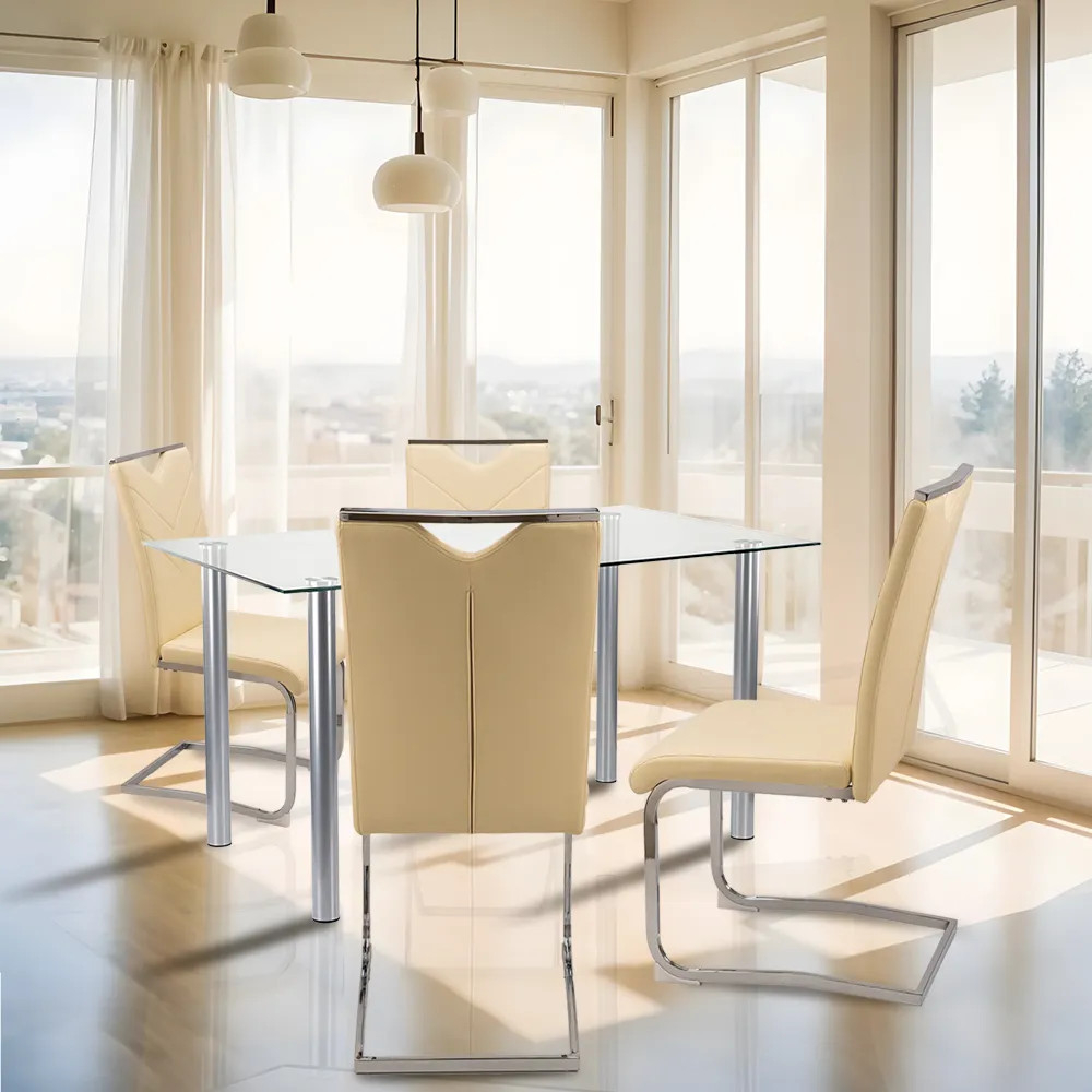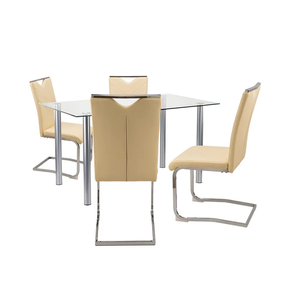 Setul de masă Nikol 4 1 în culoarea bej oferă oricărei sufragerii un aspect modern și elegant. Masa pătrată din sticlă Berna de 140 cm combină funcționalitatea și stilul cu blatul din sticlă tratată termic și picioarele metalice durabile. Cele patru scaune de dining Letti cu șezut din piele textilă bej și rame metalice care însoțesc masa garantează confort și stabilitate. Acest set este alegerea perfectă dacă doriți să creați o zonă de luat masa elegantă și practică în casa dumneavoastră.