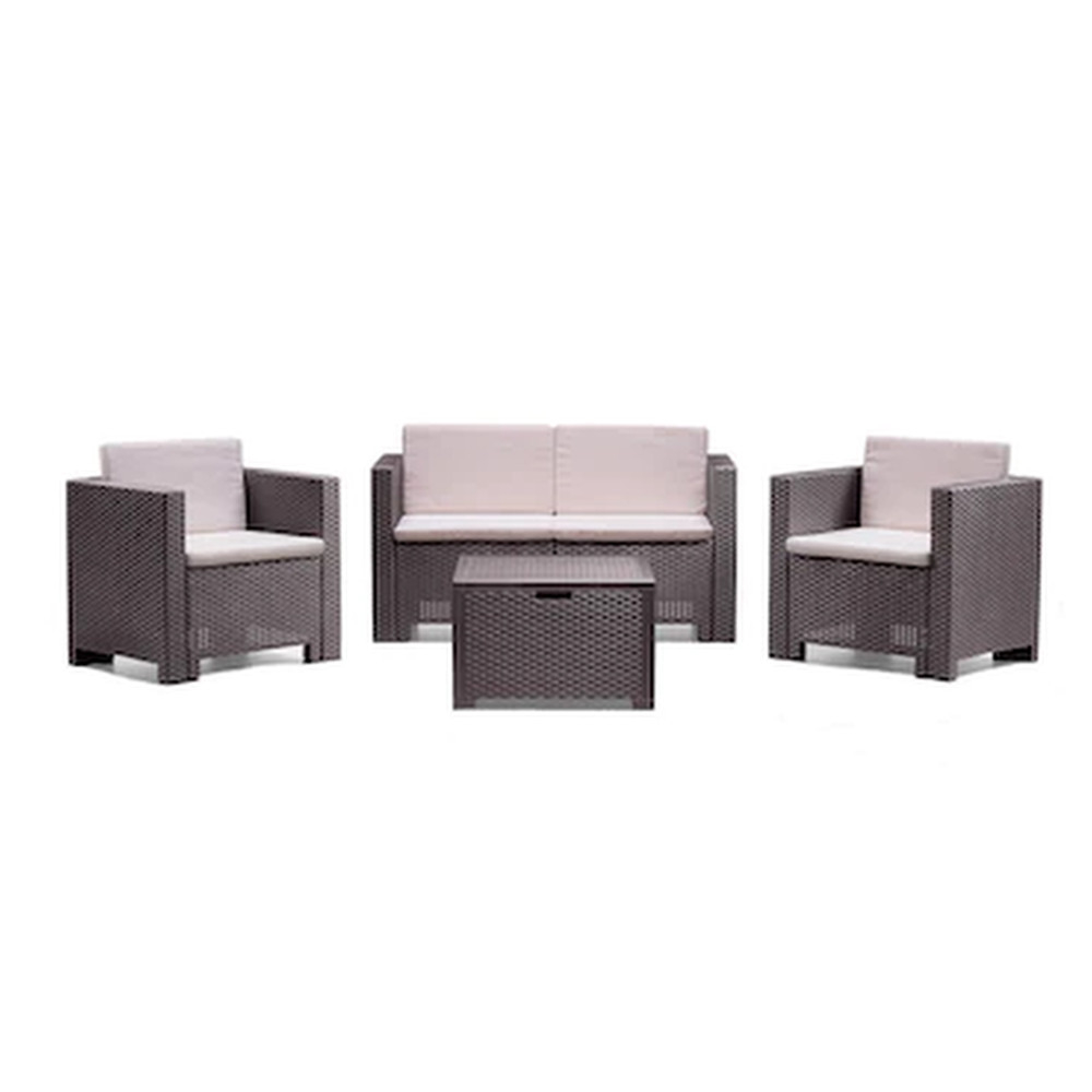 Un set elegant de mobilier care amintește de stilul ratan, fabricat în Italia , cu două fotolii, o canapea cu două locuri și o masă dreptunghiulară . Acest set de mobilier va face plăcute zilele de vară petrecute în grădină sau pe terasă. Produsele sunt dotate cu perne moi în culori elegante. Mobila cu o structură ușoară, dar stabilă, este foarte ușor de curățat. Setul este rezistent la deteriorări și condiții meteorologice pe termen lung, precum și la radiațiile UV.