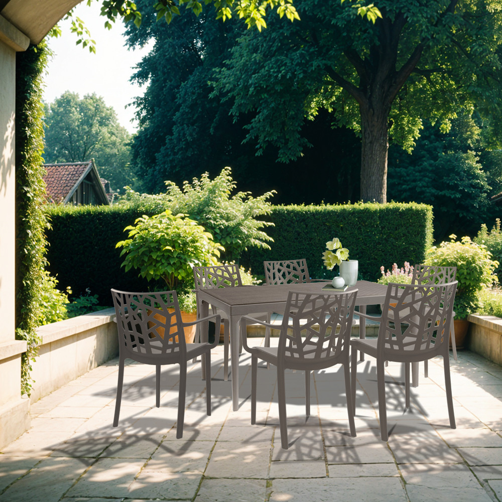 Acest set de mobilier de culoare taupe , confortabil și elegant, este fabricat în Italia. Include șase scaune de 55x 58x 82 cm și o masă pătrată înaltă de 150x 90x 74 cm. Pe lângă dimensiunile și confortul său, poate fi avantajos faptul că asamblarea sa nu necesită cunoștințe profesionale și este ușor de mutat, astfel încât să o puteți pune oricând unde aveți nevoie.