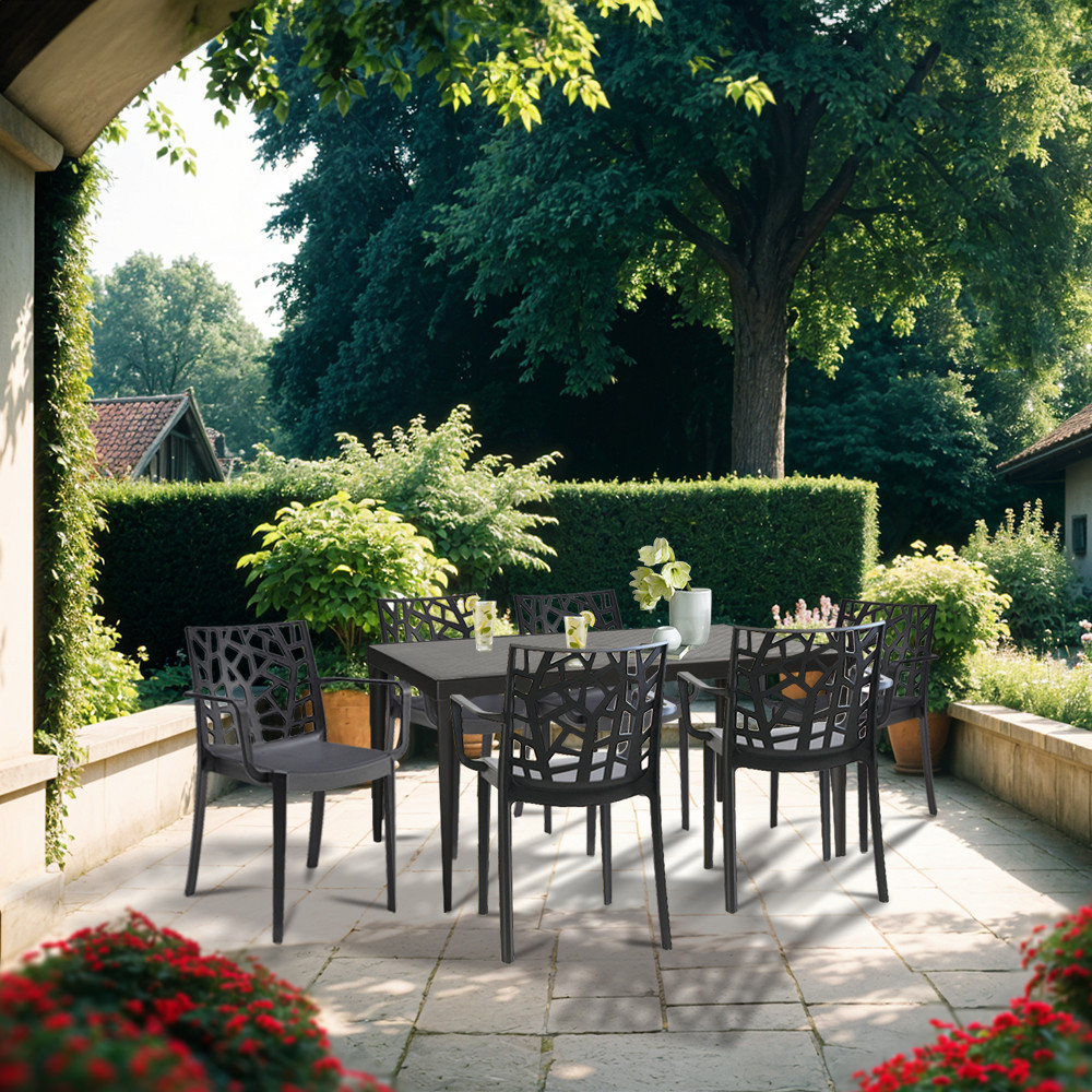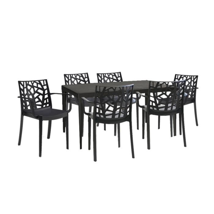 Acest set de mobilier de culoare grafit , confortabil și elegant, este fabricat în Italia. Include șase scaune de 55x 58x 82 cm și o masă pătrată înaltă de 150x 90x 74 cm. Pe lângă dimensiunile și confortul său, poate fi avantajos faptul că asamblarea sa nu necesită cunoștințe profesionale și este ușor de mutat, astfel încât să o puteți pune oricând unde aveți nevoie.