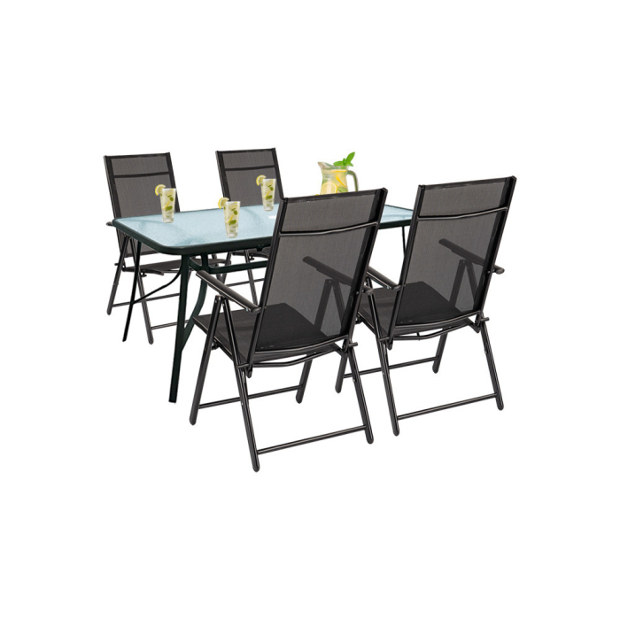 Setul include o masă dreptunghiulară din sticlă, de 150x90 cm, și patru scaune de grădină pliabile Lugo cu cadru metalic, care pot fi reglate în 7 poziții diferite pentru a asigura cea mai confortabilă ședere posibilă.