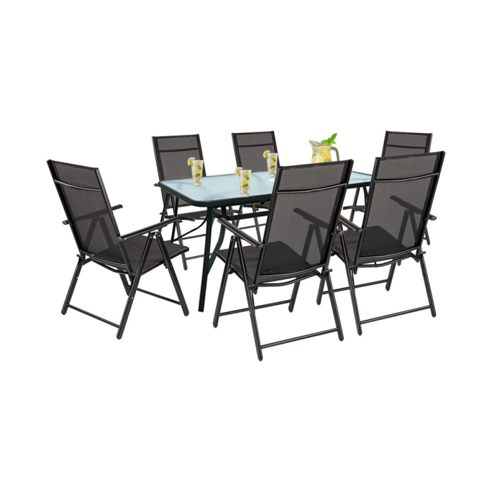 Setul include o masă dreptunghiulară din sticlă de 150x90 cm și șase scaune de grădină pliabile Lugo cu cadru metalic, care pot fi reglate în 7 poziții diferite pentru a asigura cea mai confortabilă ședere posibilă.
