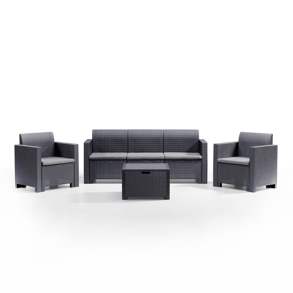 Setul elegant include mobilier elegant în stil ratan, de culoarea grafit, cu perne asortate. Mobilierul în culoarea grafitului este asociat cu perne gri, oferind confort maxim și adăugând în același timp un aspect elegant grădinii tale. Mobila este fabricată din plastic rezistent și durabil, în mare parte reciclat, ceea ce o face o alegere mai sustenabilă. Acest tip de plastic are ca rezultat mobilier ușor de mutat, dar stabil.