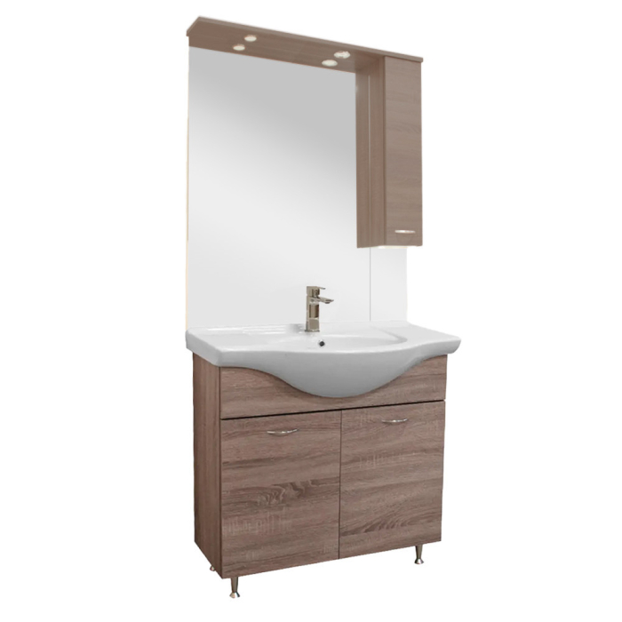 Mobilierul de baie ocupă puțin spațiu, dar are un dulap inferior spațios și un dulap superior unde puteți depozita convenabil articolele de toaletă din baie. Datorită cerințelor sale reduse de spațiu,este potrivit și pentrubăi mai mici , de exemplu în apartamente prefabricate. Produsul este fabricat din panouri de mobilier de înaltă calitate și este prevăzut cu încuietori de margine de culoare asortată. Mobilierul de baie este disponibil și în variantă de picioare.