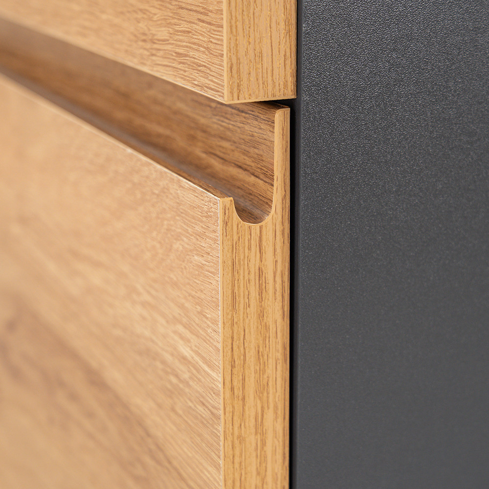 Mobilierul de baie complet Vario Pull 80 este o alegere elegantă și practică pentru băile moderne. Dimensiunile sale compacte îl fac ideal pentru băi mici și medii, iar designul cu profil J din stejar antracit conferă spațiului un aspect elegant. Închiderea amortizată a sertarelor și designul suspendat oferă confort și curățare ușoară, în timp ce materialele de calitate asigură o durată lungă de viață.