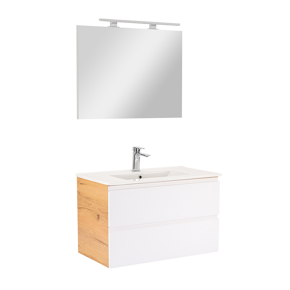 Mobilierul de baie complet Vario Pull 80 este o alegere elegantă și practică pentru băile moderne. Dimensiunile sale compacte îl fac ideal pentru băi mici și medii, iar designul din stejar și alb cu profil J conferă spațiului un aspect elegant. Închiderea amortizată a sertarelor și designul suspendat oferă confort și curățare ușoară, în timp ce materialele de calitate asigură durabilitate îndelungată.
