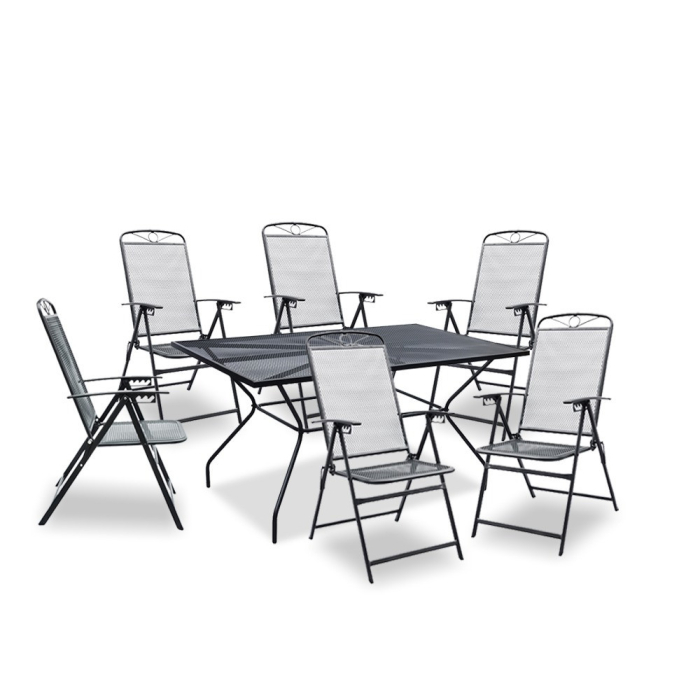 Setul include o masă mare și șase scaune confortabile. Se potrivesc perfect în multe stiluri de grădină.