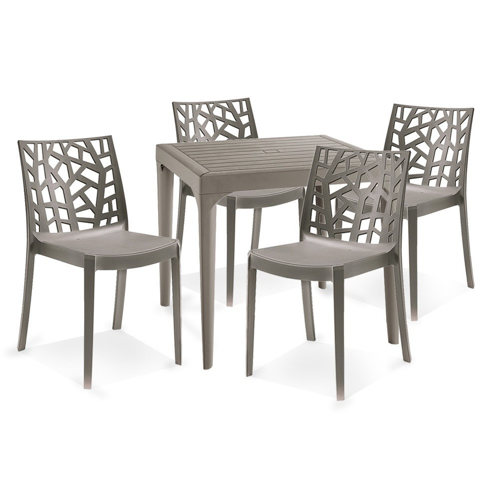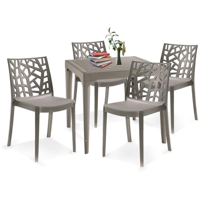 Acest set de mobilier Capo, de culoare taupe , confortabil și elegant, include patru scaune de 55x47x82 cm și o masă înaltă dreptunghiulară de 80x80x74 cm. Acest set de mobilier de grădină pentru 4 persoane oferă suficient spațiu pentru ca întreaga familie să petreacă timp în aer liber. O alegere excelentă dacă îți place să te relaxezi și să citești în curte în timpul zilei. Potrivit pentru reuniuni de familie .