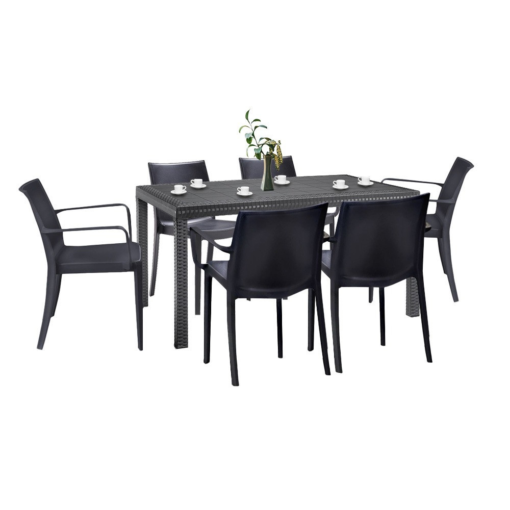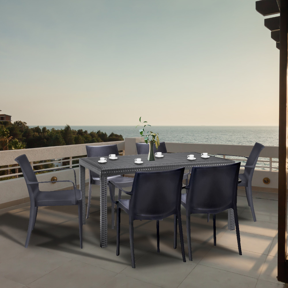 Acest set de mobilier de culoare grafit , confortabil și elegant, este fabricat în Italia. Include șase fotolii de 55x 58x 82 cm și o masă înaltă pătrată de 150x 90x 74 cm. Pe lângă dimensiunile și confortul său, poate fi avantajos faptul că asamblarea sa nu necesită cunoștințe profesionale și este ușor de mutat, astfel încât să o puteți pune oricând unde aveți nevoie.