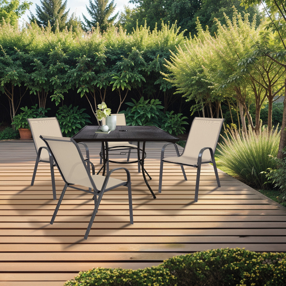 Setul de mobilier de grădină Helen 4 în 1 este alegerea perfectă pentru oricine dorește să-și facă terasa sau balconul mai confortabil și mai estetic. Acest set include o masă elegantă din plasă metalică și patru scaune confortabile din oțel negru și material textil bej. Combinația dintre designul modern și materialele durabile garantează că acest set de mobilier vă va servi mulți ani de experiențe plăcute în aer liber.
