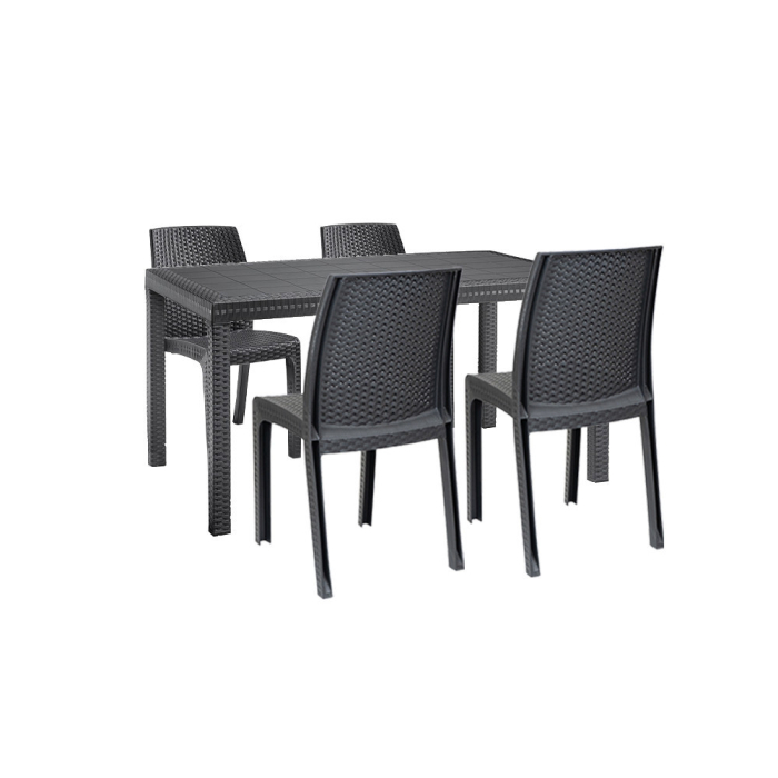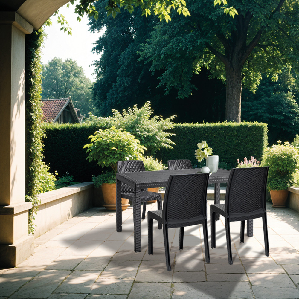 Acest set de mobilier Hellda , de culoare grafit , confortabil și elegant, include patru scaune de 4,7x59x86 cm și o masă înaltă dreptunghiulară de 90x150x74 cm. Acest set de mobilier de grădină cu 4 locuri oferă suficient spațiu pentru ca întreaga familie să petreacă timp în aer liber. O alegere excelentă dacă îți place să te relaxezi și să citești în curte în timpul zilei. Potrivit pentru reuniuni de familie . Acest set va adăuga culoare oricărei curți sau terase datorită aspectului său modern.