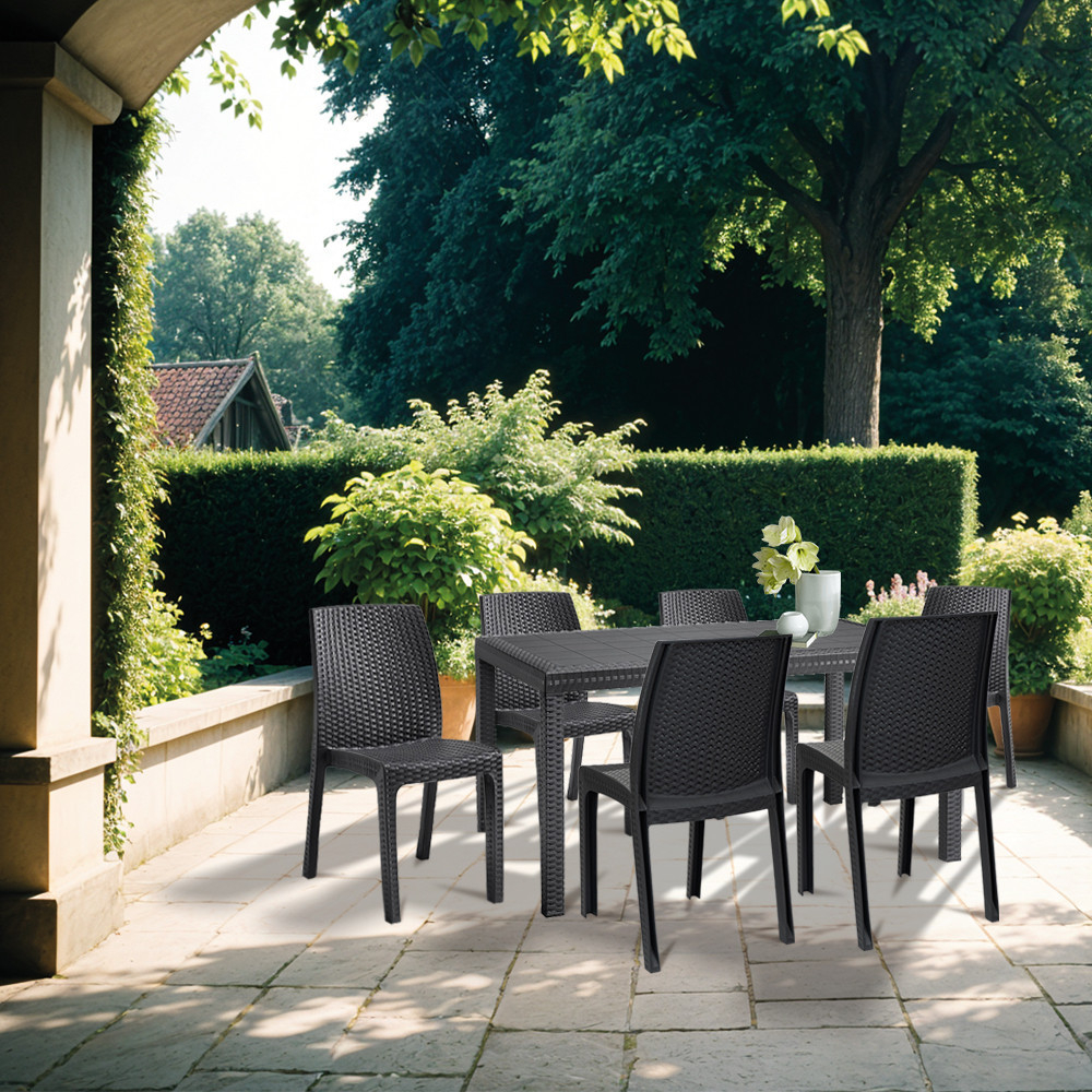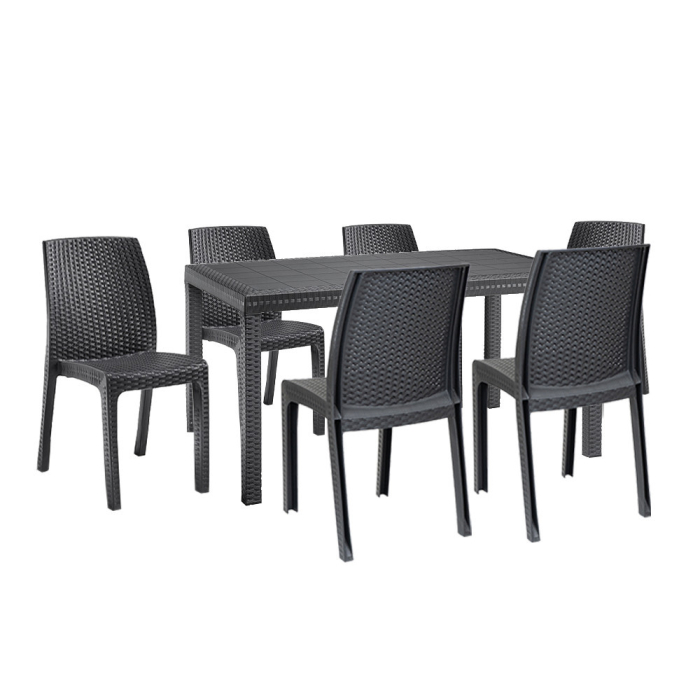 Acest set de mobilier de culoare grafit , confortabil și elegant, este fabricat în Italia. Include șase scaune de 47x 59x 86 cm și o masă pătrată înaltă de 150x 90x 74 cm. Pe lângă dimensiunile și confortul său, poate fi avantajos faptul că asamblarea sa nu necesită cunoștințe profesionale și este ușor de mutat, astfel încât să o puteți pune oricând unde aveți nevoie.
