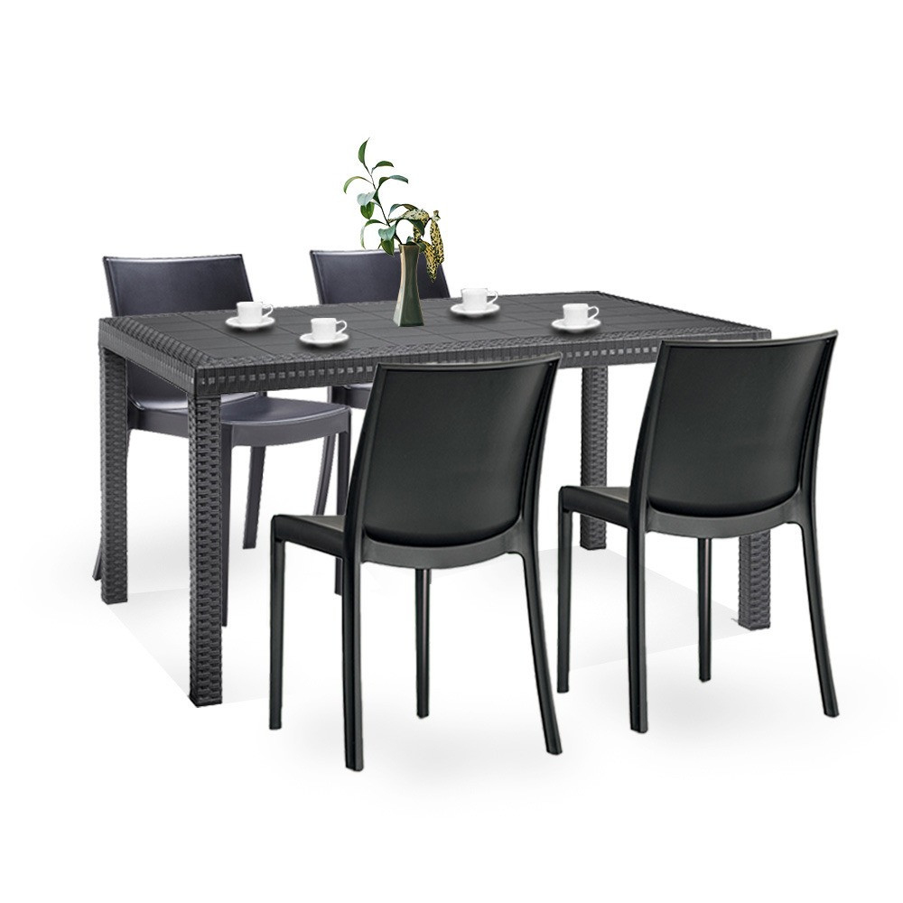 Acest set de mobilier Matera , de culoare grafit , confortabil și elegant, include patru scaune de 55x 47x 82 cm și o masă înaltă dreptunghiulară de 90x 150x 74 cm. O alegere excelentă dacă îți place să te relaxezi și să citești în curte în timpul zilei. Potrivit pentru reuniuni de familie . Datorită structurii sale, este stabil, dar este ușor de mutat, astfel încât îl puteți pune oriunde aveți nevoie.