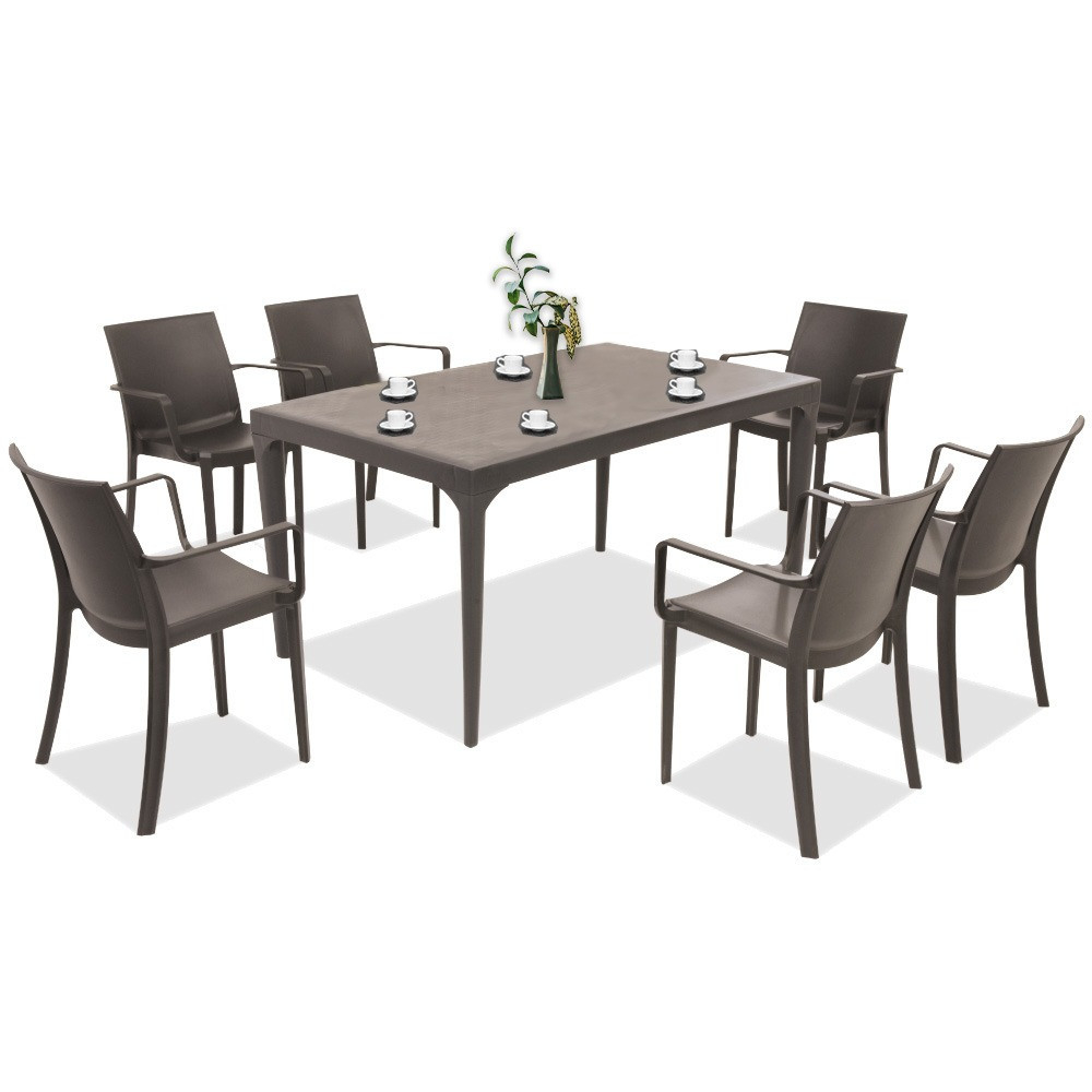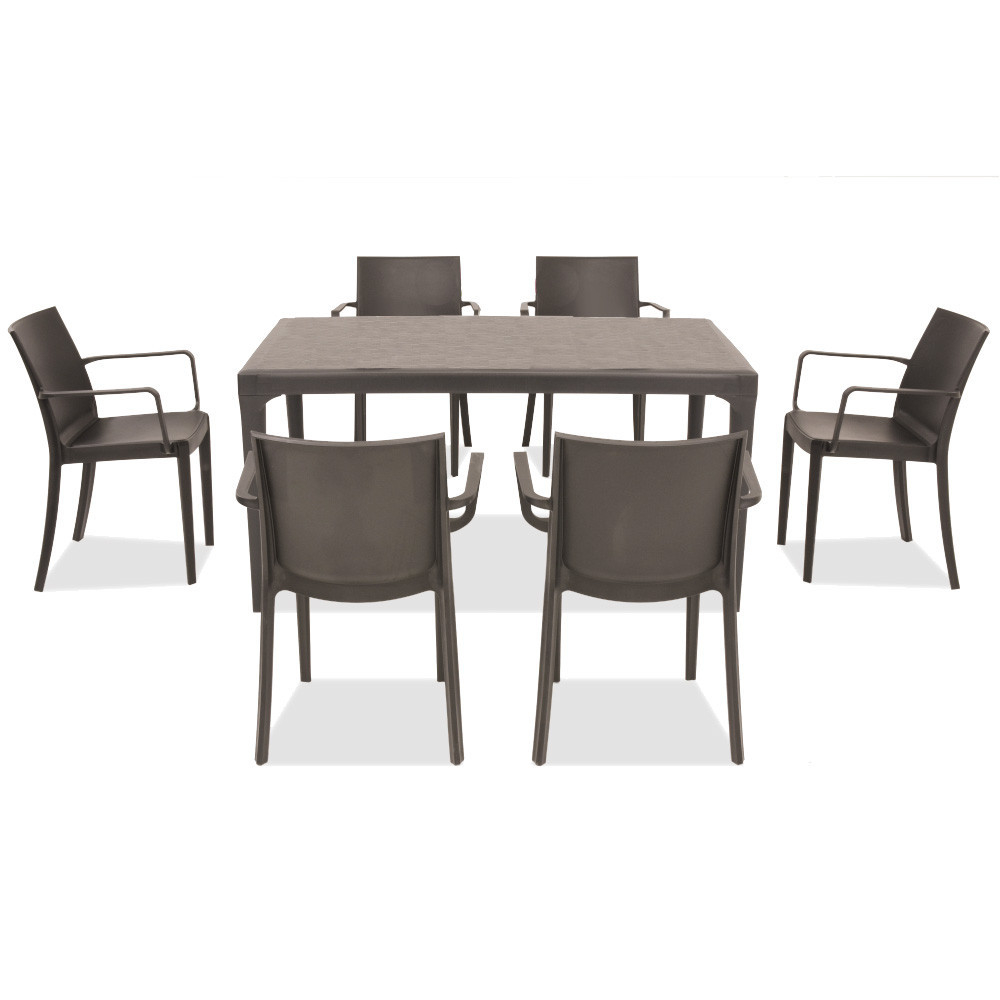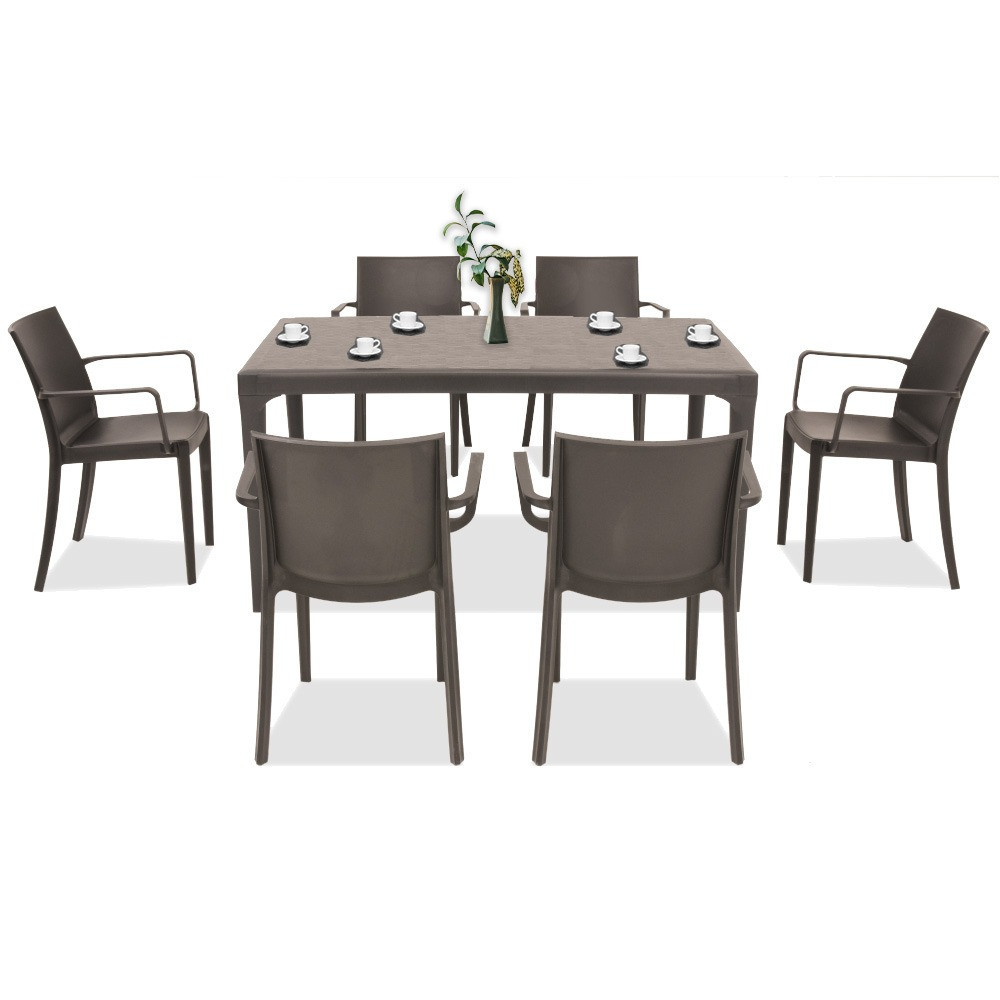 Acest set de mobilier de culoare taupe , confortabil și elegant, este fabricat în Italia. Include șase fotolii de 55x 58x 82 cm și o masă înaltă pătrată de 150x 90x 74 cm. Pe lângă dimensiunile și confortul său, poate fi avantajos faptul că asamblarea sa nu necesită cunoștințe profesionale și este ușor de mutat, astfel încât să o puteți pune oricând unde aveți nevoie.