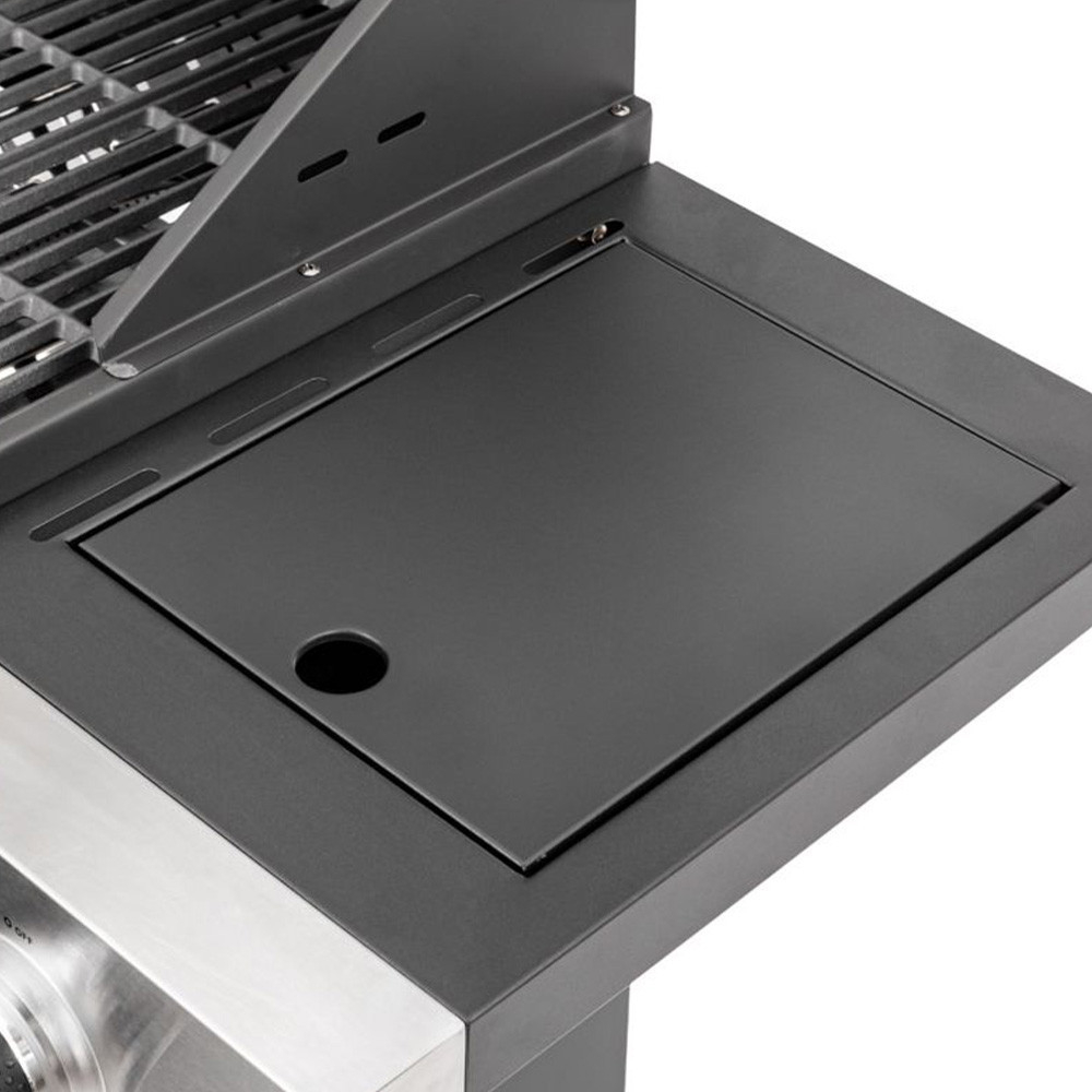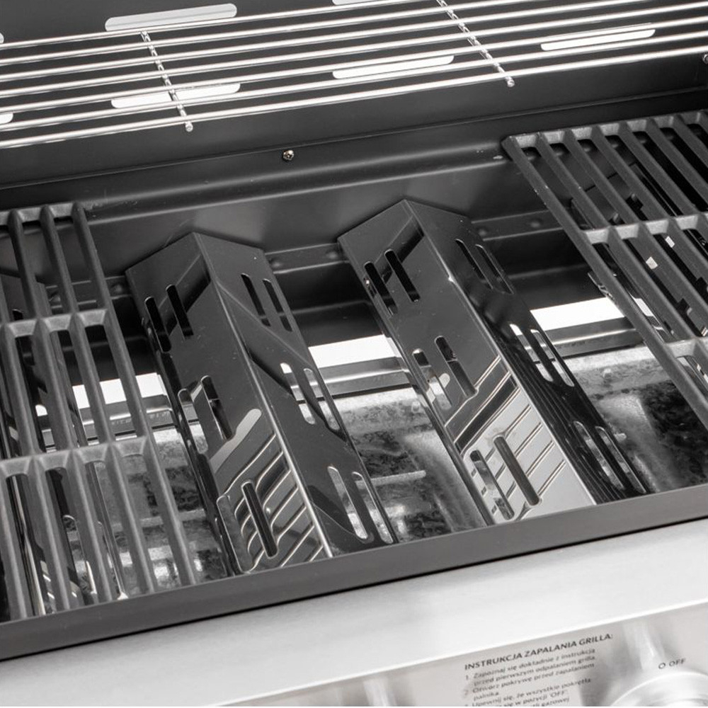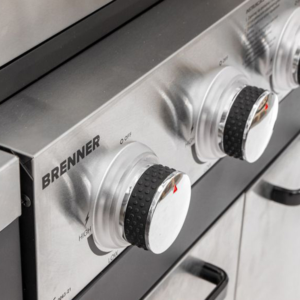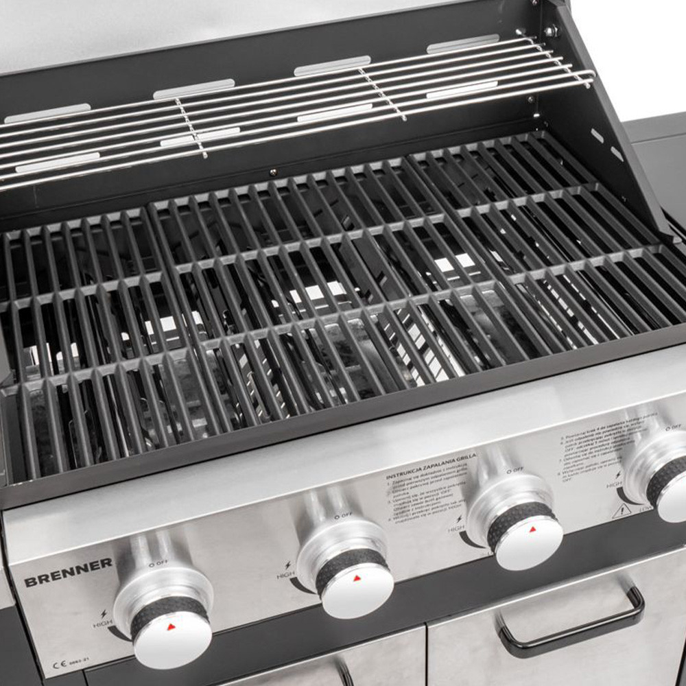 Grătarul pe gaz are 4 arzătoare principale și un arzător suplimentar pentru confortul gătitului . Panoul de control al grătarului este fabricat din oțel inoxidabil , fiind perfect pentru utilizare în exterior. Pentru confortul utilizării ulterioare a echipamentului, butoanele sunt iluminate din spate .