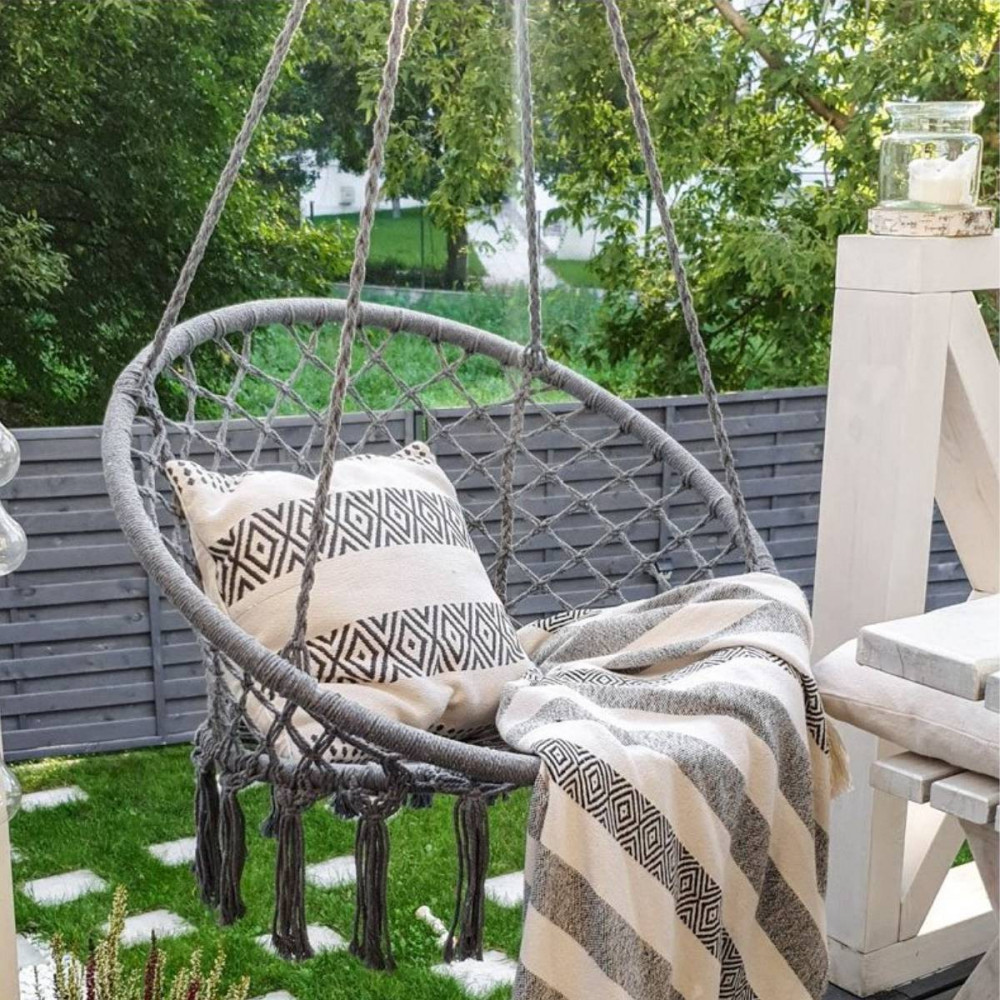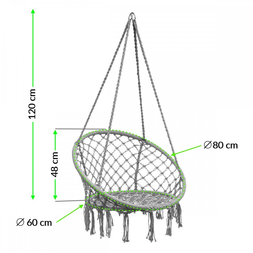 Fotoliul suspendat are 4 frânghii împletite puternic, ceea ce îl face durabil. Datorită materialelor folosite, timpul de utilizare este mai lung. Datorită dimensiunilor mari, produsul poate fi utilizat cu ușurință de către un adult. Un avantaj special al scaunului este spătarul înalt, care crește semnificativ confortul șezutului.