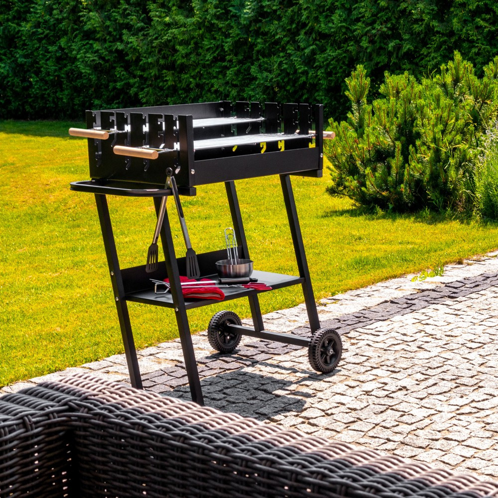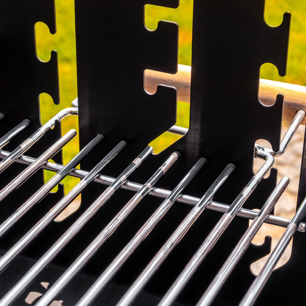 Grătarul cu cărbune este echipat cu două grătare independente cu mânere din lemn, care vă permit să gătiți alimente pe două niveluri diferite în același timp. Unul dintre grătare poate fi reglat pe 3 niveluri, în timp ce înălțimea celuilalt poate fi reglată pe 5 niveluri. Un avantaj suplimentar este creșterea suprafeței de grătar la 2200 cm².