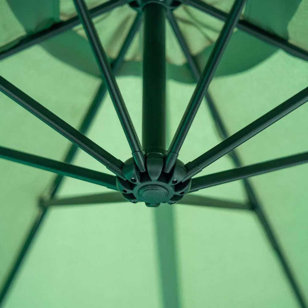 Stabilitatea umbrelei de grădină este influențată semnificativ de baza transversală. Pentru confortul dumneavoastră, este atașat un mâner pentru a plia și a desfășura produsul. Baldachinul de deasupra baldachinului vă permite să poziționați baldachinul după cum doriți și să alegeți orice loc de umbră în funcție de unghiul de incidență a luminii solare. Ventilația baldachinului permite circulația aerului.
