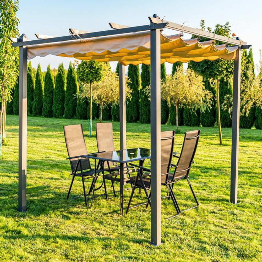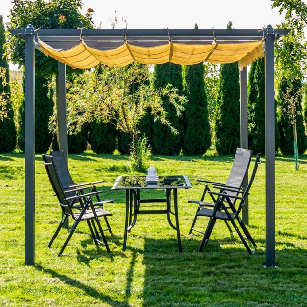 Structura pergolei de terasă este realizată din aluminiu, care se caracterizează printr-un grad ridicat de rezistență la coroziune. Picioarele și grinzile din aluminiu contribuie semnificativ la stabilitatea pergolei de grădină. Pentru partea superioară a pergolei din aluminiu se folosește poliester cu un strat de PA. Pergolele din aluminiu sunt ușor de asamblat.