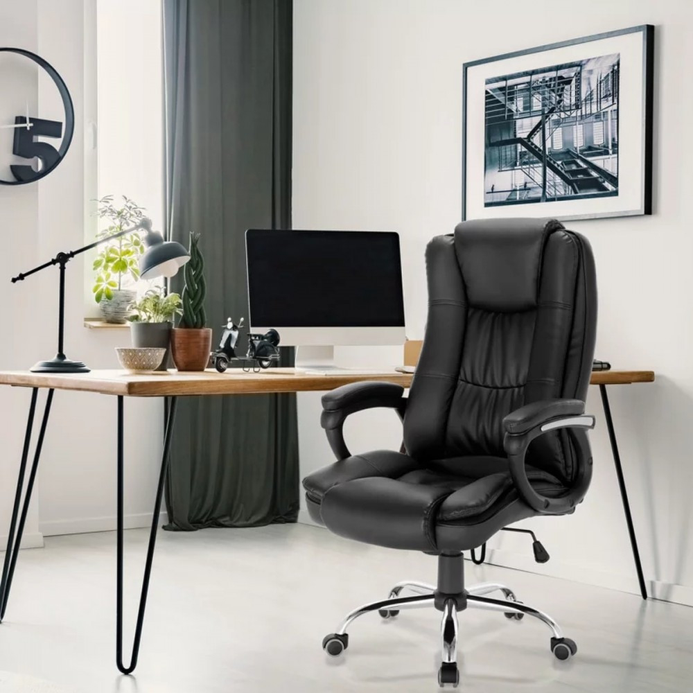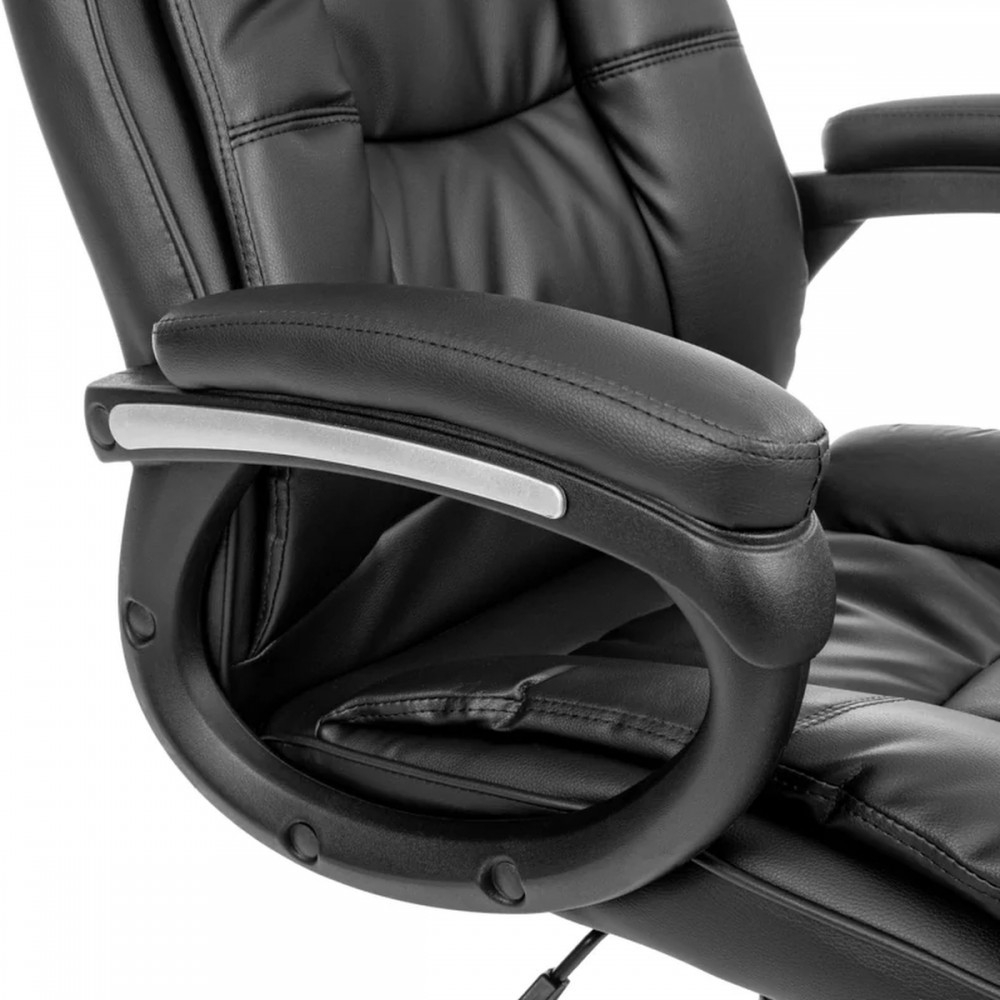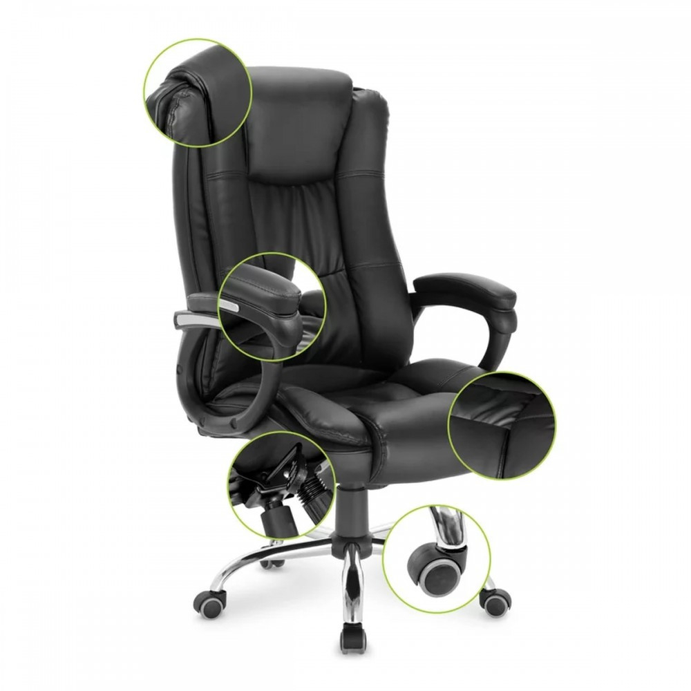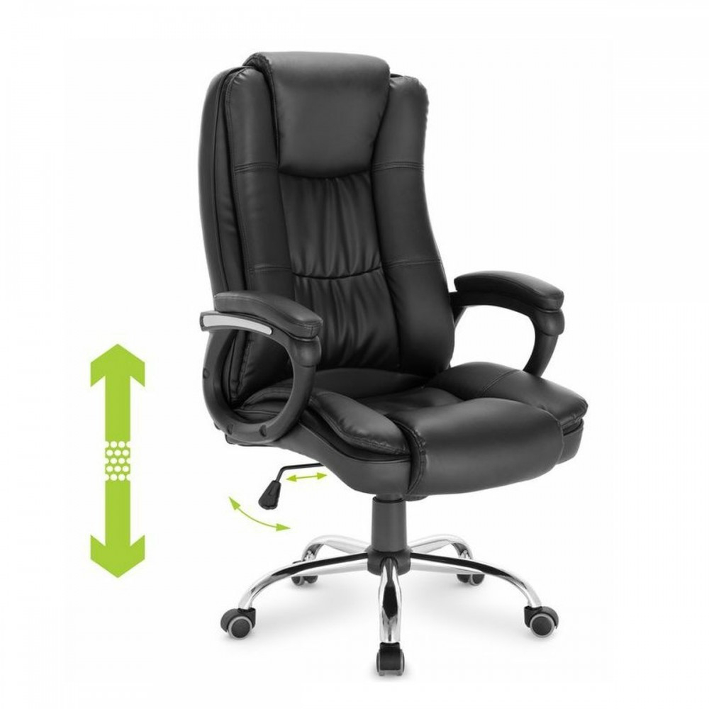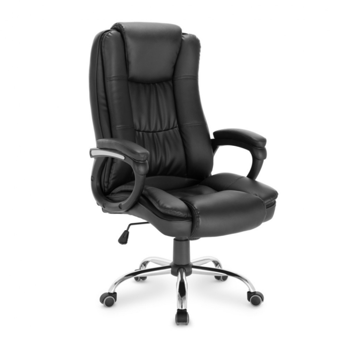 Tapițeria scaunului de birou este confecționată din piele ecologică rezistentă și moale. Curățarea este ușoară. Stratul dublu de spumă îmbunătățește semnificativ nivelul de confort, ceea ce este apreciat în special în timpul lucrului pe termen lung. Baza cu 5 stele a scaunului rotativ este acoperită cu un finisaj cromat durabil, care completează aspectul business al scaunului de birou . Lățimea bazei scaunului de birou asigură stabilitatea acestuia. Un element important al scaunului rotativ sunt roțile din nailon care protejează podeaua de zgârieturi.