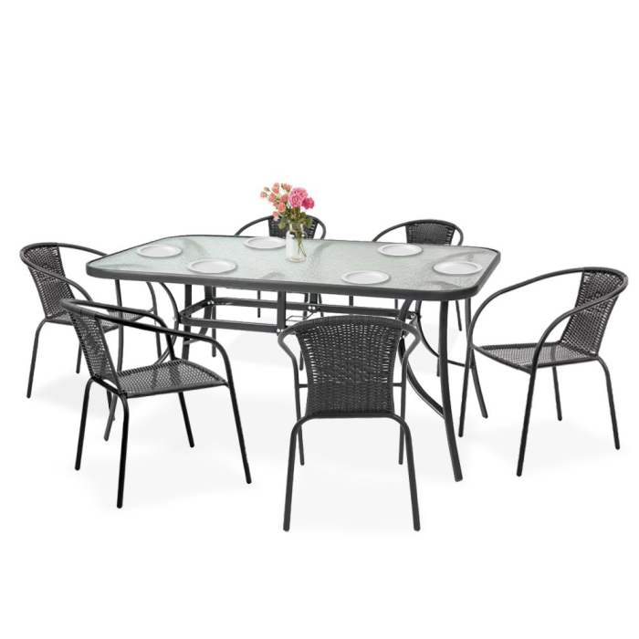 Setul modern de mobilier de grădină include o masă de grădină cu blat de sticlă și 6 scaune. Mobila este concepută pentru 6 persoane . Scaunele și baza mesei sunt fabricate din oțel. Blatul mesei este fabricat din sticlă securizată de 5 mm , rezistentă la zgârieturi minore. Spătarul scaunului permite circulația aerului. Șezutul și cotierele cu profil ergonomic susțin coloana vertebrală. Designul modern se integrează estetic în orice mediu.
