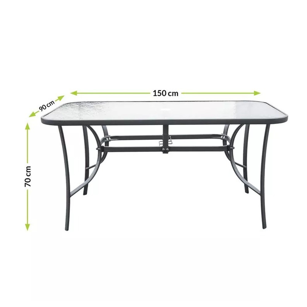 Setul modern de mobilier de grădină include o masă de grădină cu blat de sticlă și 4 scaune. Mobila este concepută pentru 4 persoane . Scaunele și baza mesei sunt fabricate din oțel. Blatul mesei este fabricat din sticlă securizată de 5 mm , rezistentă la zgârieturi minore. Materialul șezutului din textilenă este rezistent la condițiile meteorologice, iar caracteristica sa specială este că puteți regla unghiul spătarului în până la 7 moduri diferite . Avantajul său constă în scaunul și cotierele profilate ergonomic , care ușurează umerii în timpul odihnei.