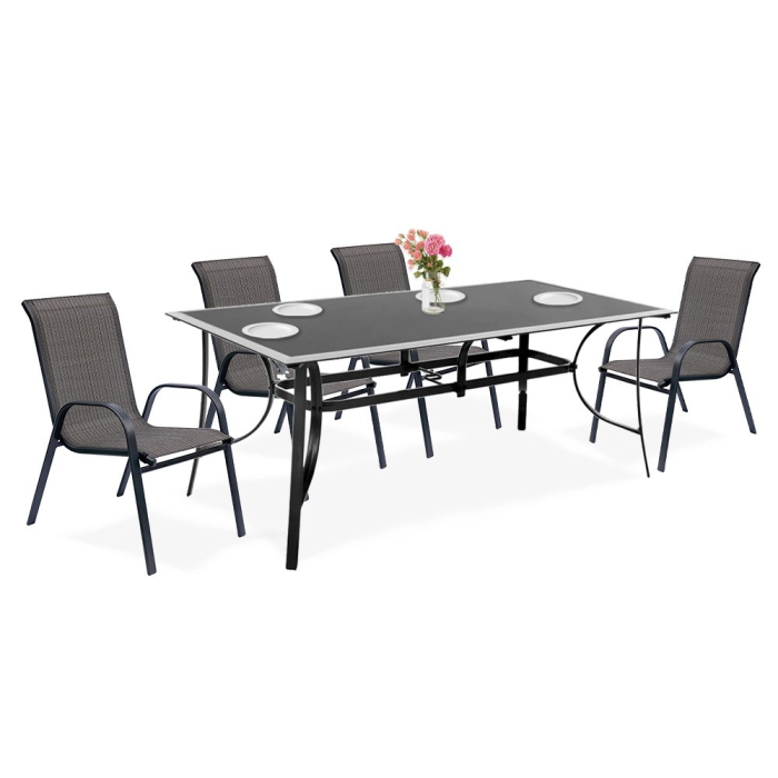 Masa de grădină este perfectă și pentru o terasă sau un balcon. Înălțimea potrivită a mesei cu blat de sticlă permite o cină confortabilă în aer liber. Structura blatului de grădină este fabricată din aluminiu, iar picioarele sunt din oțel. Blatul mesei este fabricat din sticlă securizată de 5 mm, rezistentă la zgârieturi minore. Sunt rezistente la intemperii, iar materialele folosite asigură o durată de viață mai lungă .