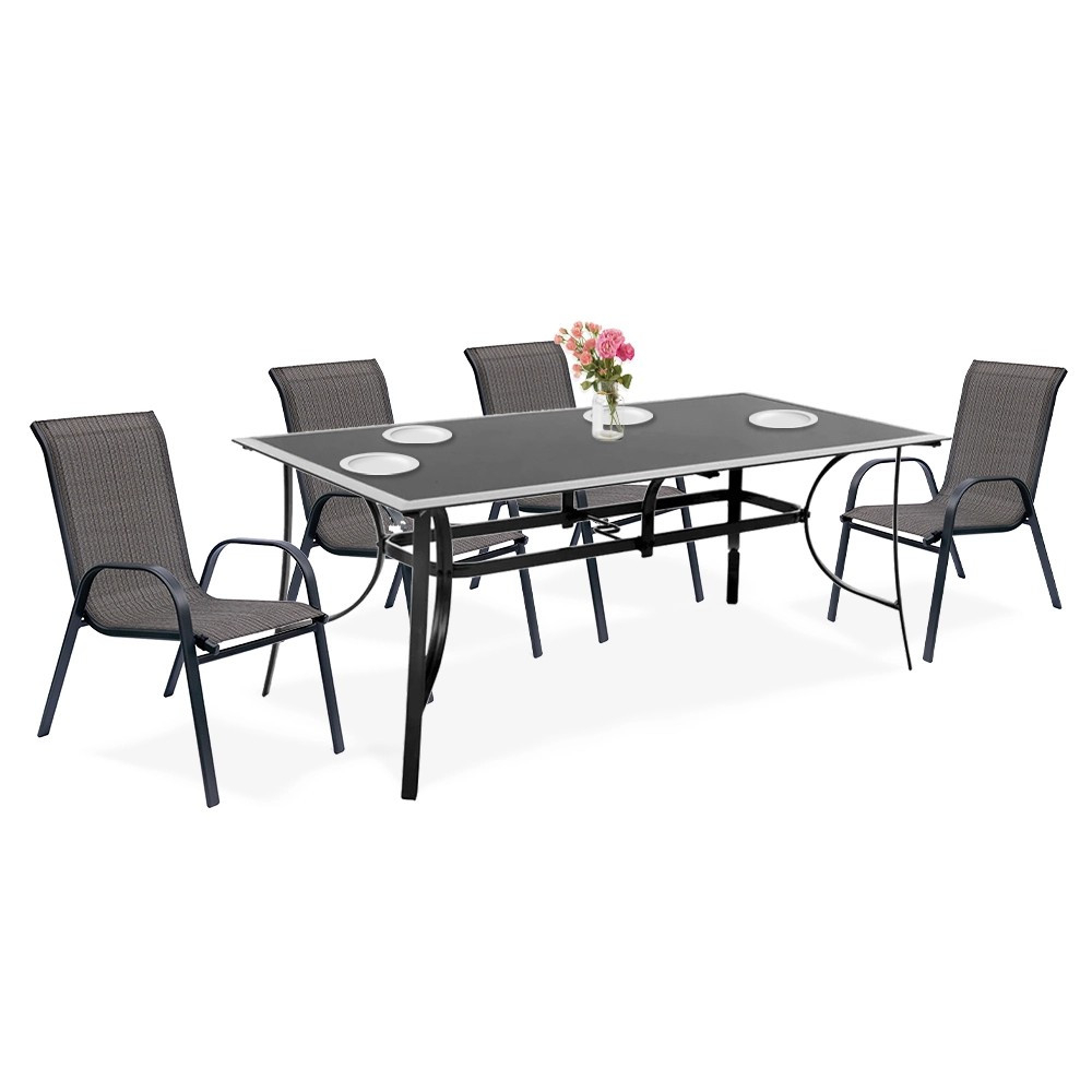 Setul de mobilier este conceput pentru 4 persoane , ceea ce vă permite să îl utilizați în timpul întâlnirilor cu cei dragi. Este proiectat la înălțimea potrivită, astfel încât să puteți lua prânzul sau alte mese confortabil. În structura mesei a fost încorporată o gaură suplimentară pentru a stabiliza umbrela. Designul simplu al picioarelor, distanțate larg, asigură stabilitate. Scaunul de grădină este ușor de transportat