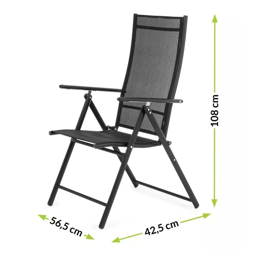 Setul modern de mobilier de grădină include o masă de grădină cu blat de sticlă și 4 scaune. Mobila este concepută pentru 4 persoane . Scaunele și baza mesei sunt fabricate din oțel. Blatul mesei este fabricat din sticlă securizată de 5 mm , rezistentă la zgârieturi minore. Materialul șezutului din textilenă este rezistent la condițiile meteorologice, iar caracteristica sa specială este că puteți regla unghiul spătarului în până la 7 moduri diferite . Avantajul său constă în scaunul și cotierele profilate ergonomic , care ușurează umerii în timpul odihnei.