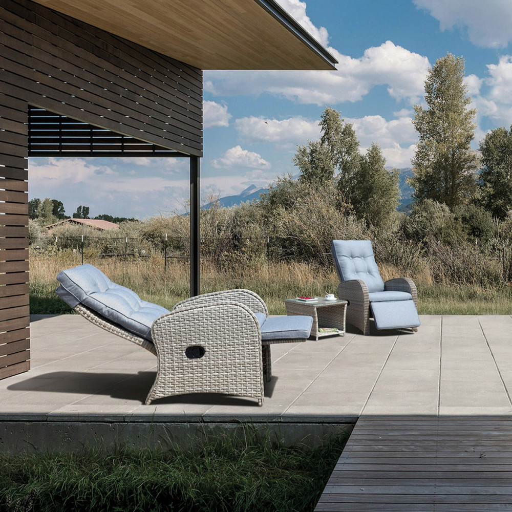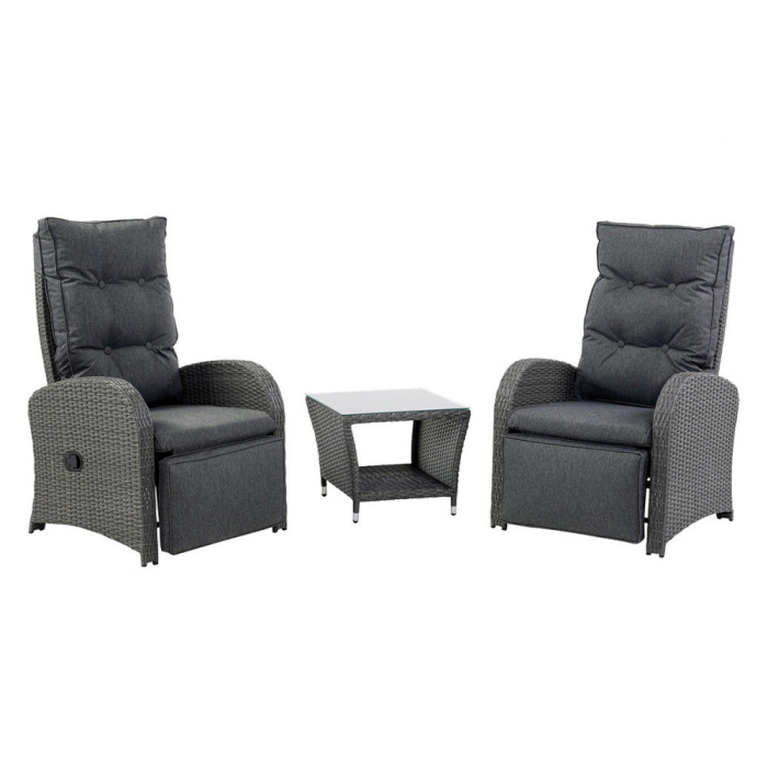 Bucură-te de momente de odihnă, bunăstare și relaxare cu setul de mobilier de grădină Songo . Setul este alcătuit din trei piese de mobilier, două scaune și o masă. Dimensiunile scaunului reglabil (LxÎxA): 66x79x103 cm, iar dimensiunile mesei (LxÎxA): 49x49x40 cm. Creează-ți locul ideal pentru relaxare sau un pui de somn în grădină, pe terasă sau pe balcon cu spătarul și suportul pentru picioare reglabile ușor, controlate de un mâner de pe lateralul scaunului. Pernele moi de pe scaune sunt fabricate din poliester, care este rezistent la uzură și absoarbe foarte puțină apă. Blatul mesei practice este fabricat din sticlă securizată, ceea ce reprezintă un mare avantaj în ceea ce privește siguranța. Schema de culori a setului este o combinație atemporală de negru și gri închis. Capacitatea maximă de încărcare a unui scaun este de 110 kg.