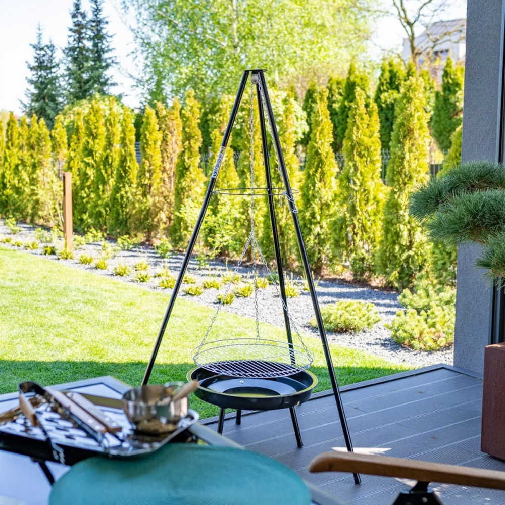 Tigaia grill cu suport este un element separat care îmbunătățește considerabil stabilitatea și siguranța. Folosirea unui suport deasupra plitei de gătit vă permite să pregătiți mesele fără nicio bătaie de cap. Datorită grătarului cromat agățat de un lanț, grătarul este perfect pentru mese comune sau evenimente de seară.