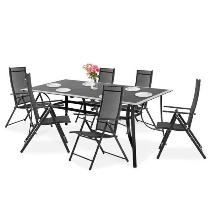 Setul modern de mobilier de grădină include o masă de grădină cu blat de sticlă și 6 scaune. Mobila este concepută pentru 6 persoane . Scaunele și baza mesei sunt fabricate din oțel. Blatul mesei este fabricat din sticlă securizată de 5 mm , rezistentă la zgârieturi minore. Materialul șezutului din textilenă este rezistent la condițiile meteorologice, iar caracteristica sa specială este că puteți regla unghiul spătarului în până la 7 moduri diferite . Avantajul său constă în scaunul și cotierele profilate ergonomic , care ușurează umerii în timpul odihnei.