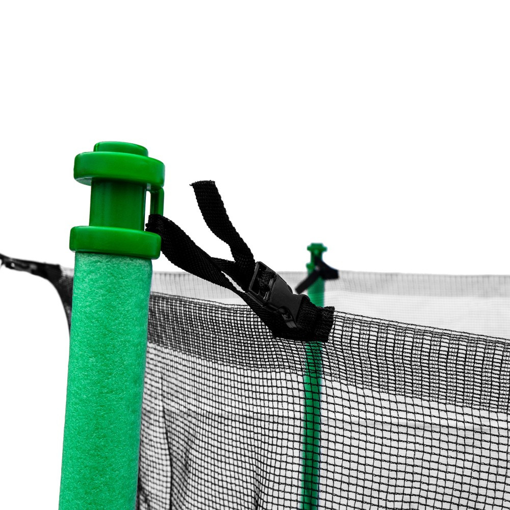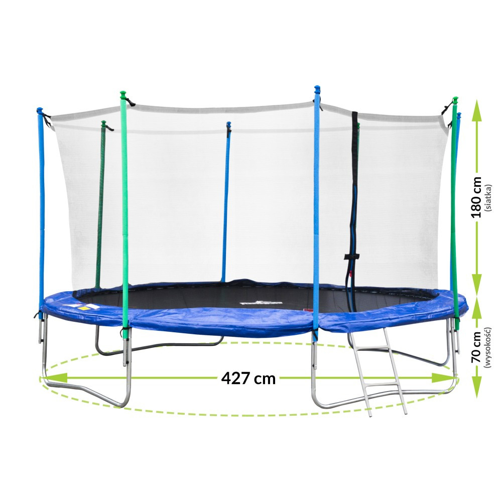 Trambulina mare, concepută în principal pentru utilizare în grădină, are o plasă interioară de 180 cm înălțime, care asigură siguranța chiar și la sărituri înalte. Plasa se închide cu fermoar - previne căderea de pe trambulină.