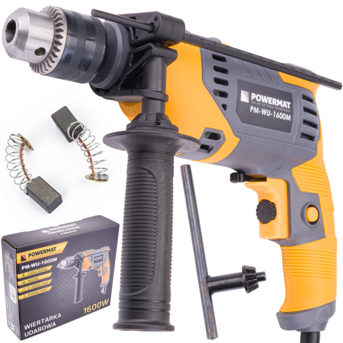 Mașină de găurit POWERMAT cu o putere de 1600 W , control lin al vitezei și un buton care permite funcționarea continuă, ceea ce ușurează semnificativ munca.