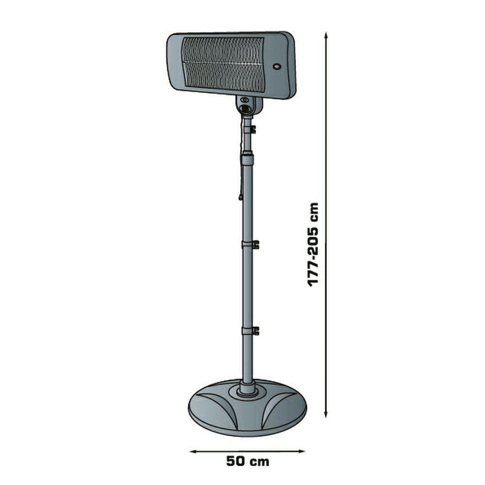 3 niveluri de încălzire: 650 W / 1350 W / 2000 W\nraport ridicat de căldură radiantă\nProtecție IPX4 împotriva stropirii de apă\nideal pentru încălzirea terasei\nse oprește când este înclinat\nfuncționare silențioasă\nsuport din oțel inoxidabil\ngreutate dispozitiv: 8 kg\nlungime cablu de conectare: 1,8 m\nalimentare: 230 V~ / 50 Hz