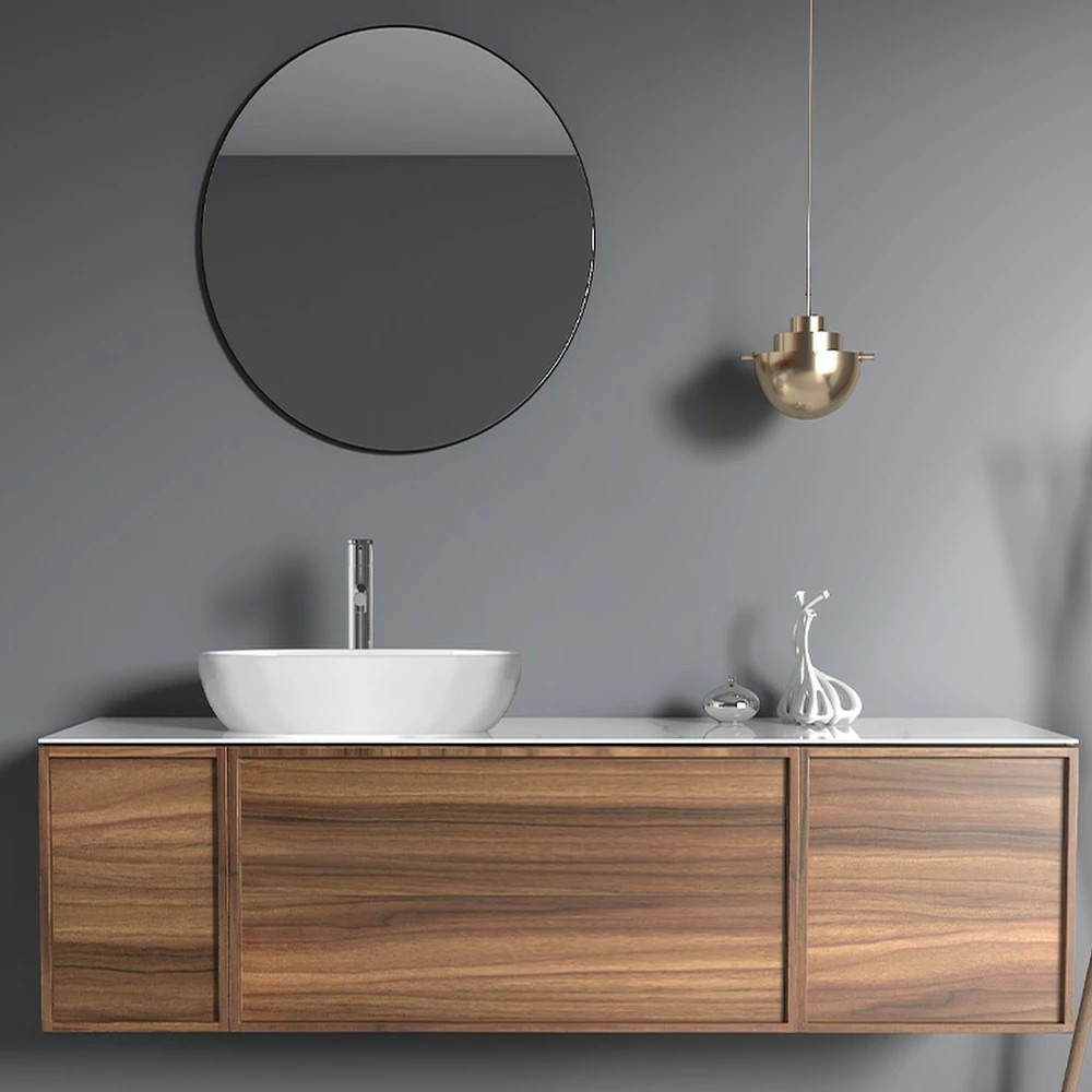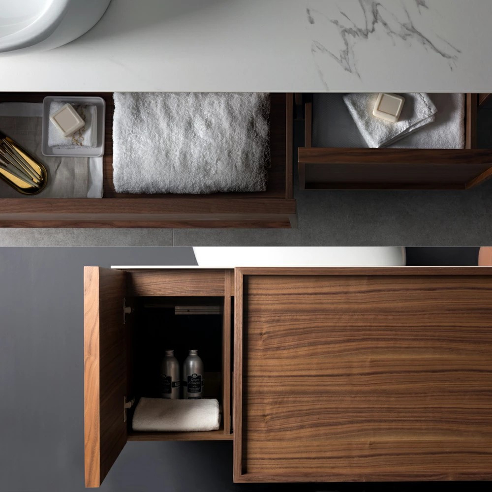 Caracteristica specială acolecției noastre Tripolieste faptul că mobilierul este realizat cu o bază solidă de nuc, care oferă o senzație de lux la prima vedere. Acest set de baie este, de asemenea, dovada că puteți amesteca cu încredere formele rotunde și pătrate, deoarece atunci când acestea se potrivesc bine, rezultatul final este fabulos. Bucurați-vă de armonia culorilor liniștitoare în fiecare zi! Blum are un sistem de sertare cuînchidere ușoară și călcare.