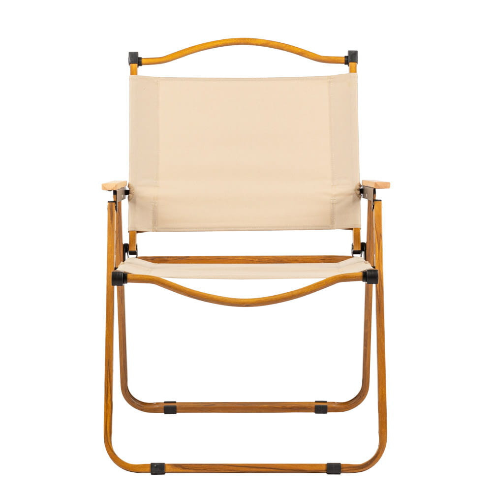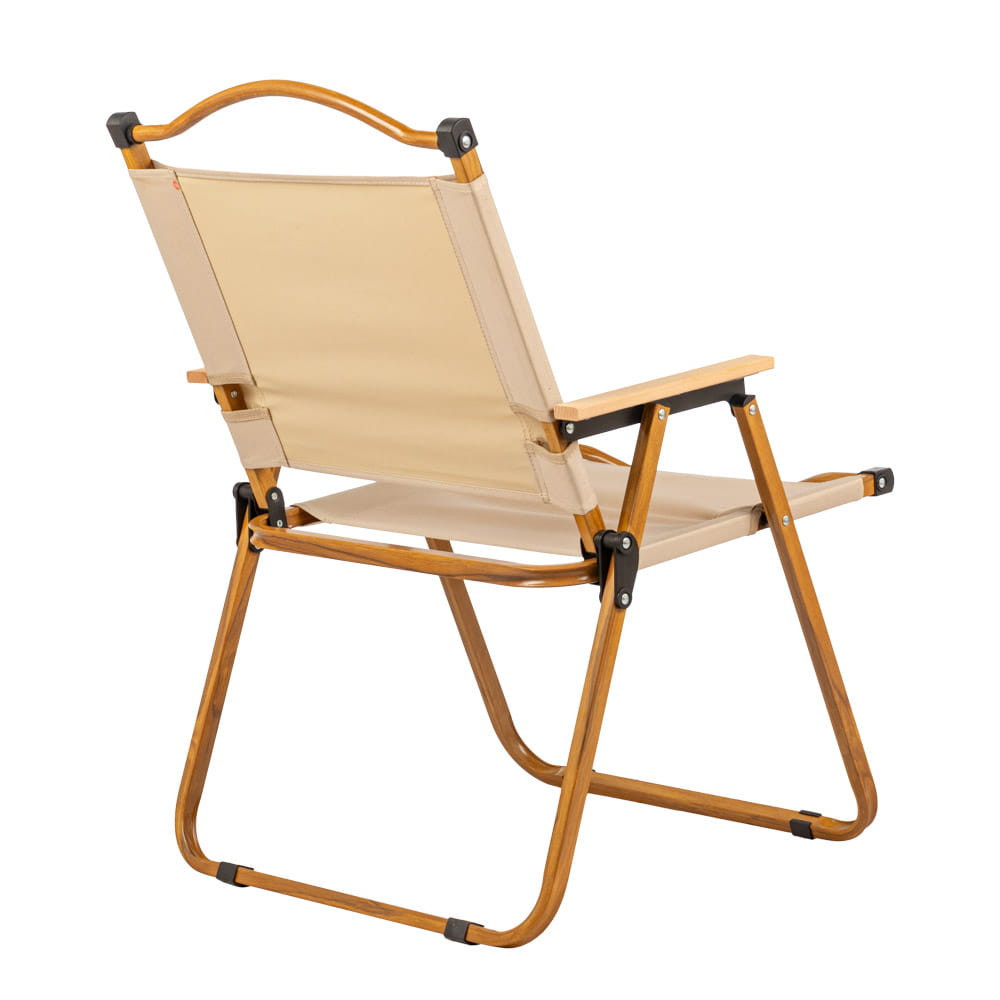 Scaunul de camping confortabil combină funcționalitatea și eleganța. Scaunul cu spătar mai înalt oferă confort pentru relaxare în aer liber . Cadrul este fabricat din oțel cu un finisaj vopsit cu efect de lemn, care garantează fiabilitatea și rezistența structurii. Cotierele din lemn adaugă un farmec suplimentar, subliniind în același timp durabilitatea.