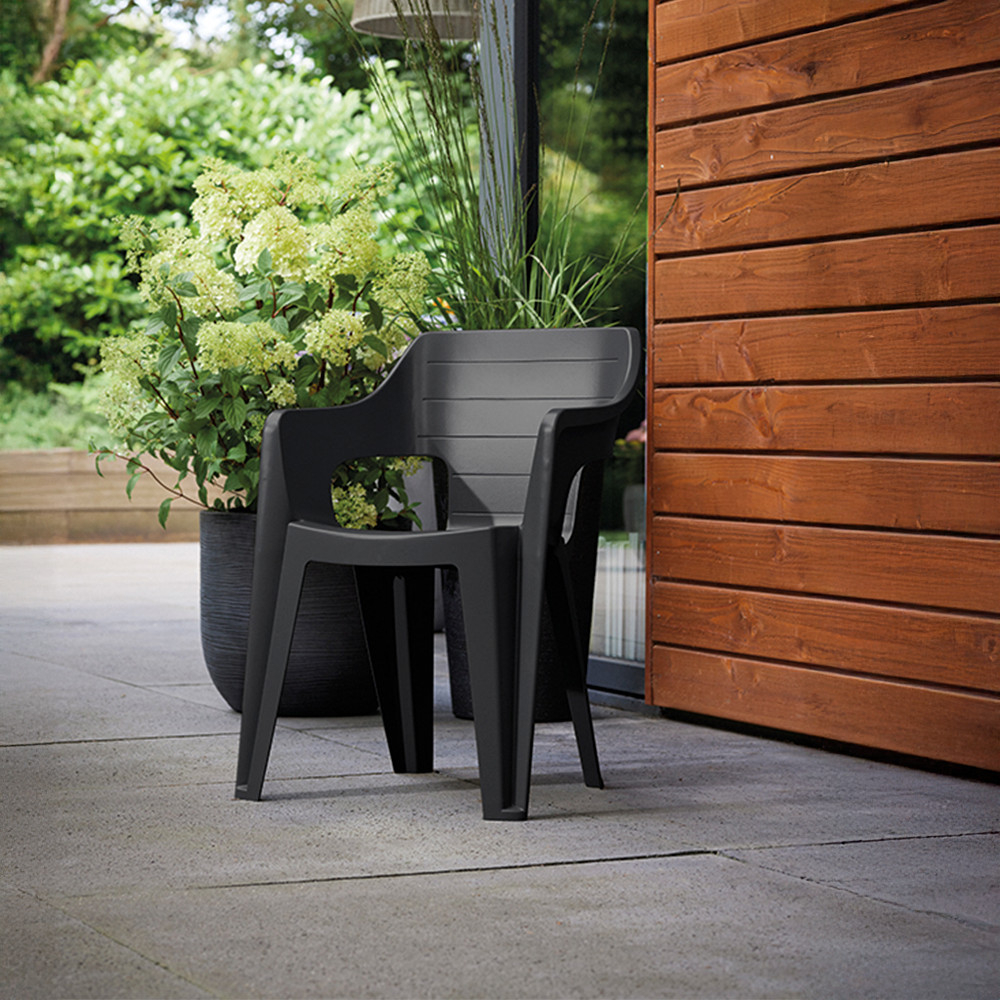 Scaunul de grădină din plastic cu cotiere Keter Bilbao Lowback nu este doar estetic, ci și extrem de practic. Orificiul de drenaj asigură că apa nu rămâne la suprafață după ploaie sau udare, astfel încât este întotdeauna gata de utilizare. Datorită designului suprapunibil, poți elibera spațiu imediat ce nu ai nevoie de toate scaunele. Plasticul rezistent la intemperii asigură că rămâne elegant ani de zile - nici soarele, nici ploaia nu îl vor afecta.