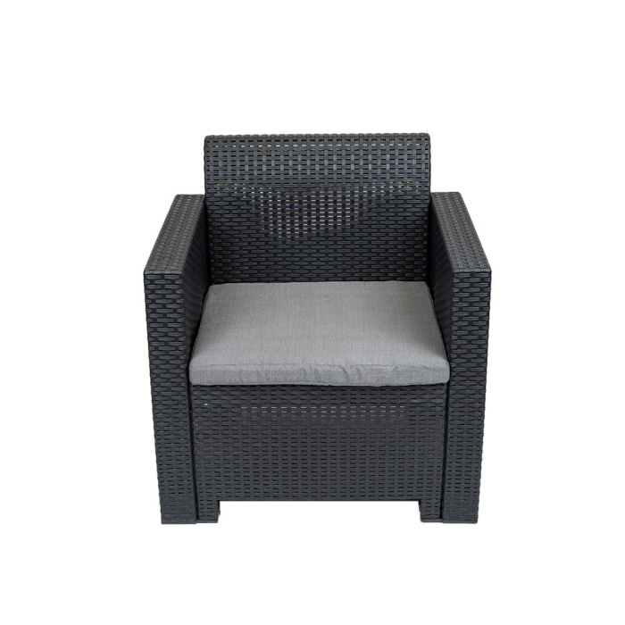 Numele acestui scaun de grădină, fabricat în Italia, este puțin înșelător, deoarece oferă confortul unui fotoliu datorită designului confortabil al pernei și cotierelor. Culoarea grafit și suprafața din technoratan, care amintește de ratanul original, conferă mobilierului un aspect elegant și modern, sporind atmosfera oricărui spațiu exterior, fie că este vorba de o grădină, un balcon sau o terasă de restaurant. Această piesă de mobilier este o alegere atemporală, deoarece nu necesită întreținere și este fabricată din plastic rezistent la radiațiile UV și la condițiile meteorologice.