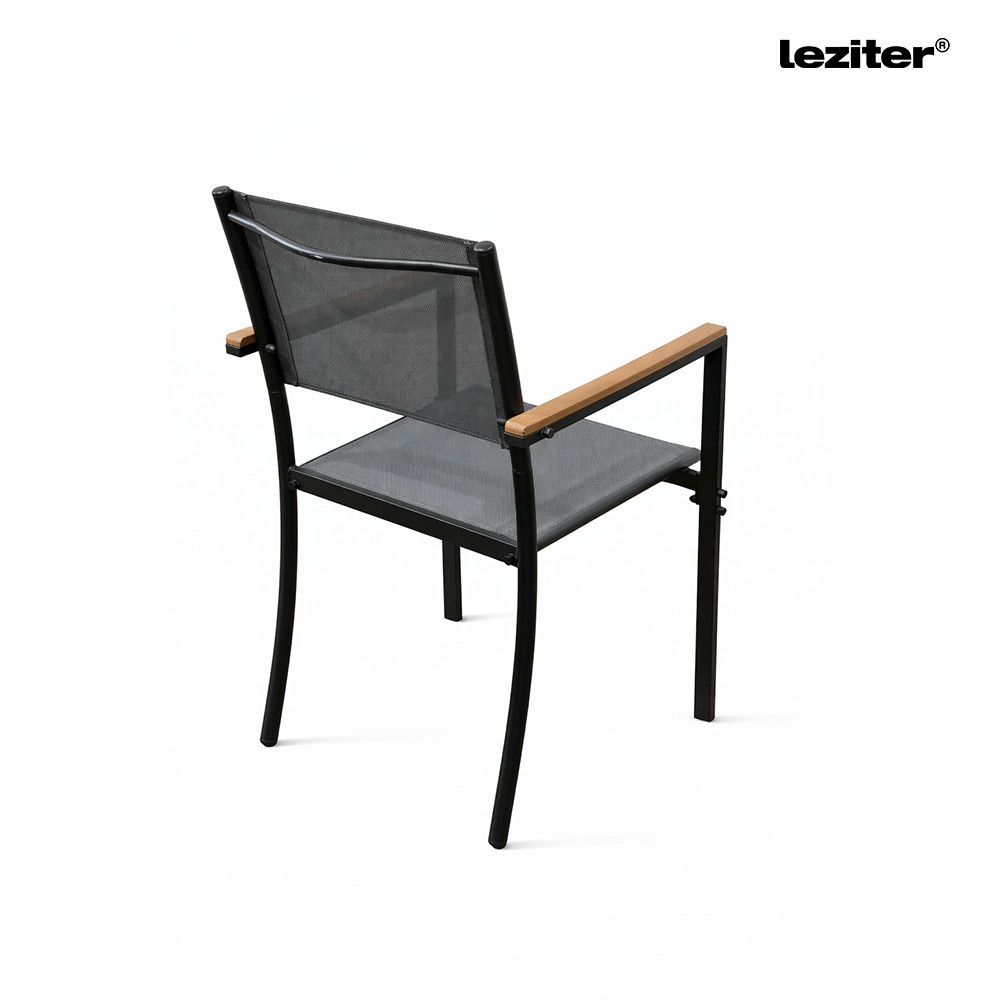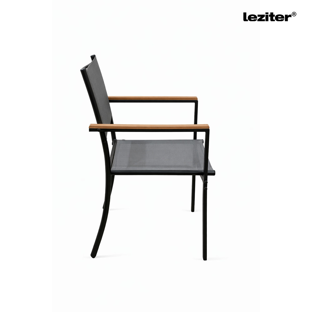 Scaunul de grădină Leziter Lido este realizat cu un cadru metalic cu finisaj acoperit cu pulbere, care oferă structurii un suport stabil. Șezutul și spătarul au o suprafață textilă cu design ferm, care oferă un loc bine susținut. Designul cadrului și utilizarea materialului pentru șezut conferă împreună scaunului un aspect uniform și curat.