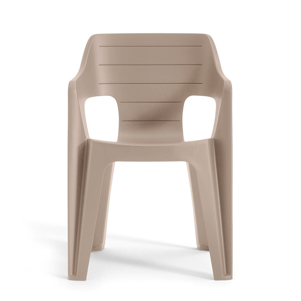 Suprafața mulată a scaunului și cotierele confortabile asigură o ședere confortabilă chiar și în timpul utilizării prelungite. O gaură de scurgere în scaun împiedică apa să rămână pe scaun după ploaie sau curățare, astfel încât acesta poate fi utilizat din nou rapid. Plasticul durabil din polipropilenă este rezistent la intemperii, astfel încât scaunul își va păstra aspectul în mediul exterior pentru o perioadă lungă de timp.
