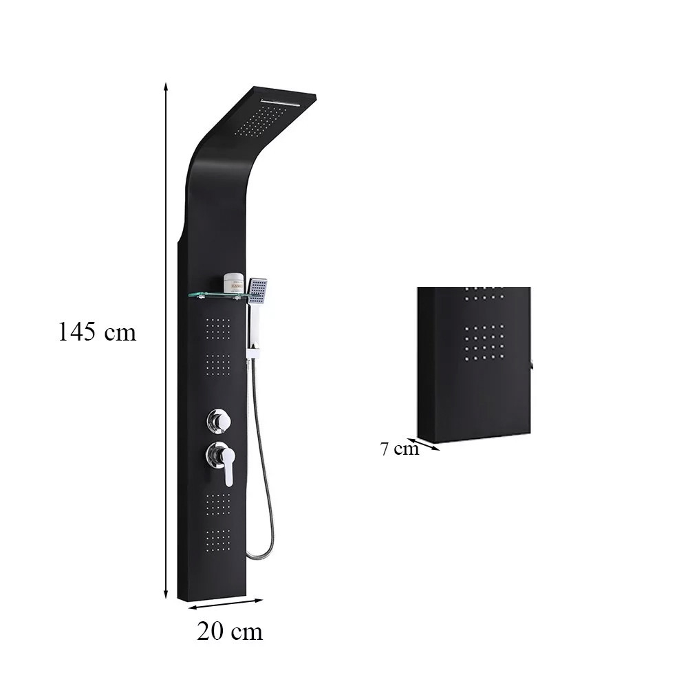Panoul de duș este dotat cu un furtun din oțel inoxidabil lung de 150 cm, care vă permite să mutați capul de duș și să îl utilizați cu ușurință. În plus, pe panou există un raft practic din sticlă, unde puteți așeza cosmetice și alte articole de care aveți nevoie în timpul dușului. Panoul de duș cu hidromasaj Alegro Black are o înălțime de 145 cm, o lățime de 20 cm și o adâncime de 7 cm, fiind o soluție compactă și care economisește spațiu pentru baia dumneavoastră. Alegerea materialului din oțel inoxidabil nu numai că garantează durabilitate și longevitate, dar îi conferă și un aspect elegant și modern.